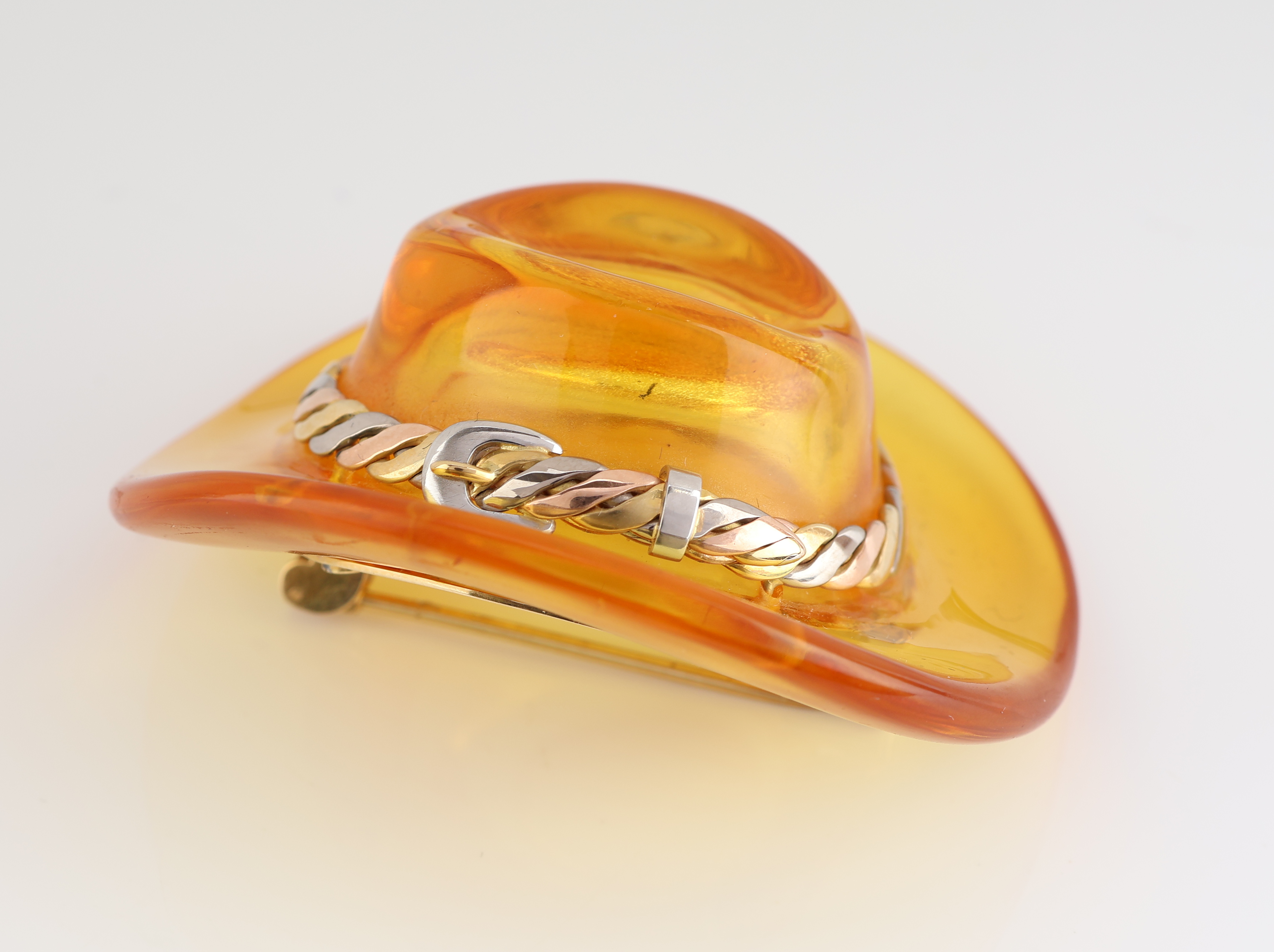 18 kt Gold Bernstein-Brosche "Hut", GG/WG/RG 750/000, Einzelanfertigung eines renommierten Idar-Obersteiner Goldschmieds, Hut aus einem Stück Bernstein geschnitten und geschliffen, ca. 5.2 x 5.2 cm, Unikat