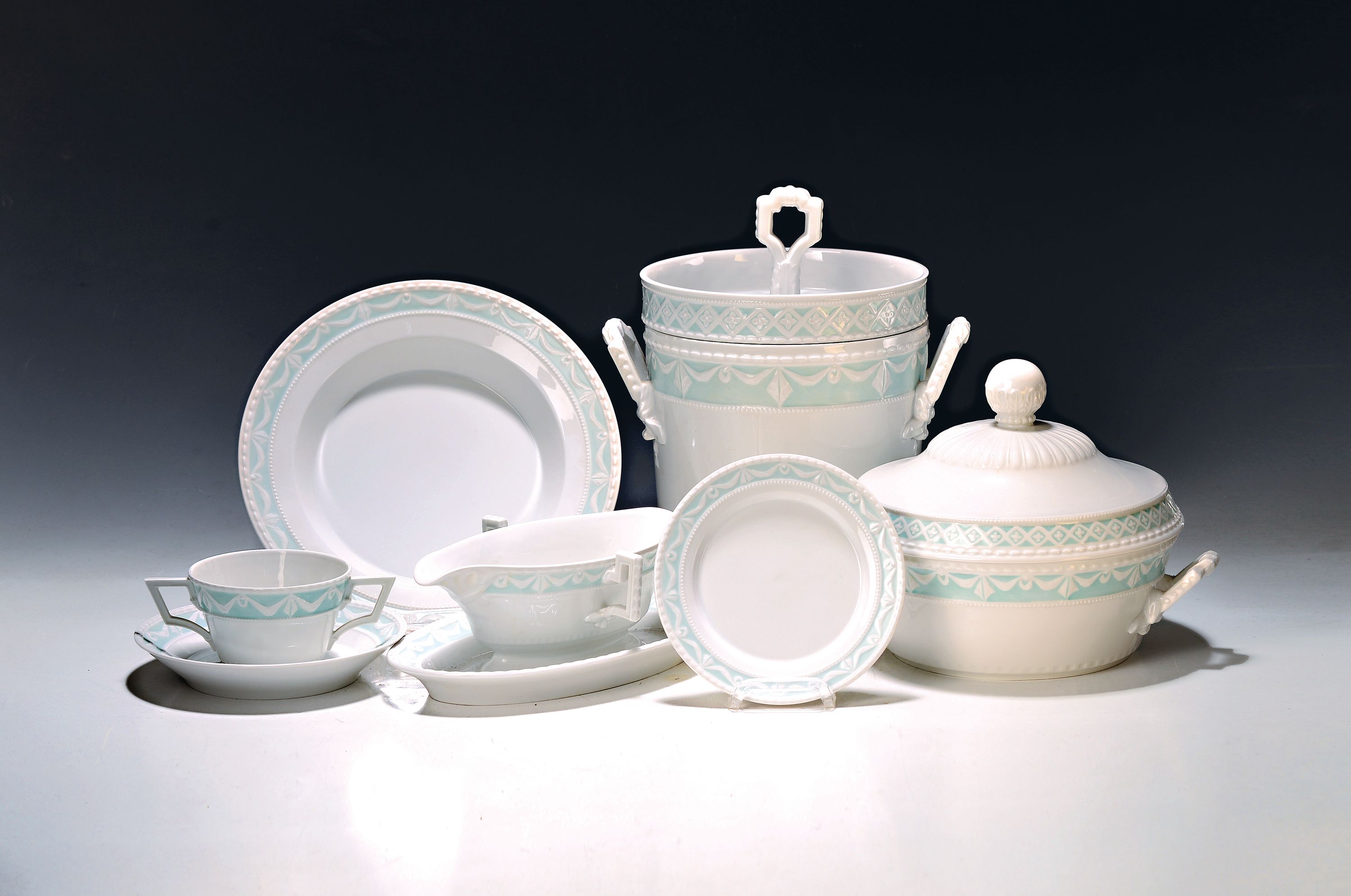 Tafelservice, KPM Berlin, Kurland, Pastellfond Lagune, 8 tiefe Teller/ Suppenteller,
