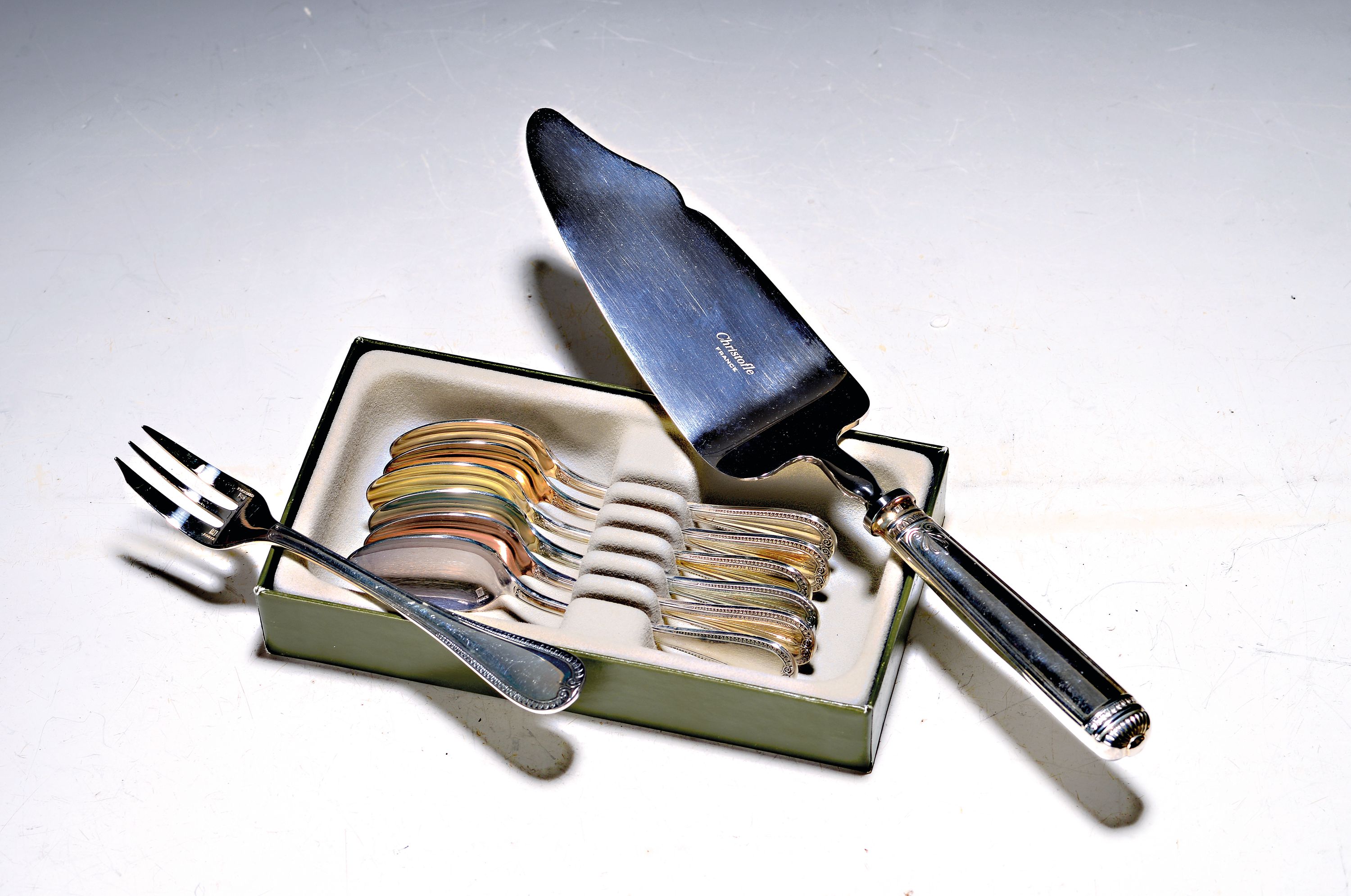 Kuchenbesteck, Christofle, Paris, Malmaison, Kuchenheber, 6 Kaffeelöffel und 6 Kuchengabeln, z.T. orig. Kartons