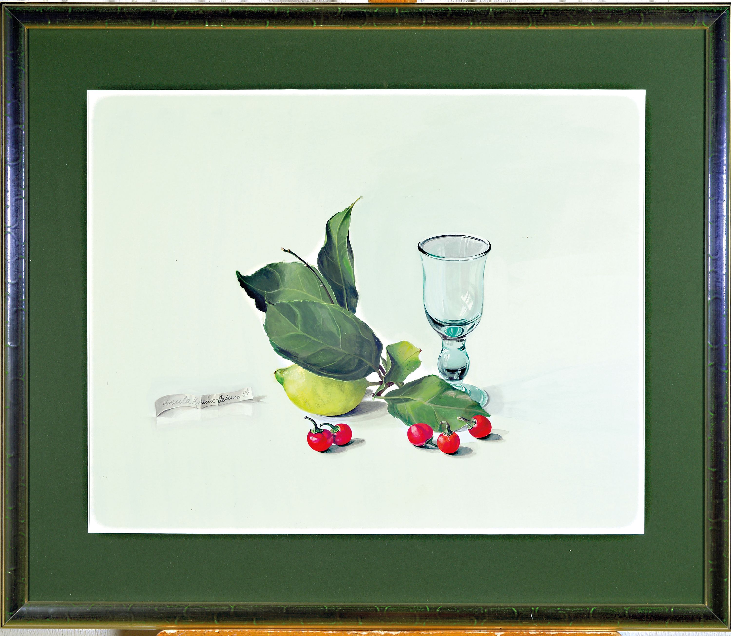 Ursula Krause-Oehme, geb. 1932, Stillleben mit Zitrone, Kirschen und Glas, sign.,