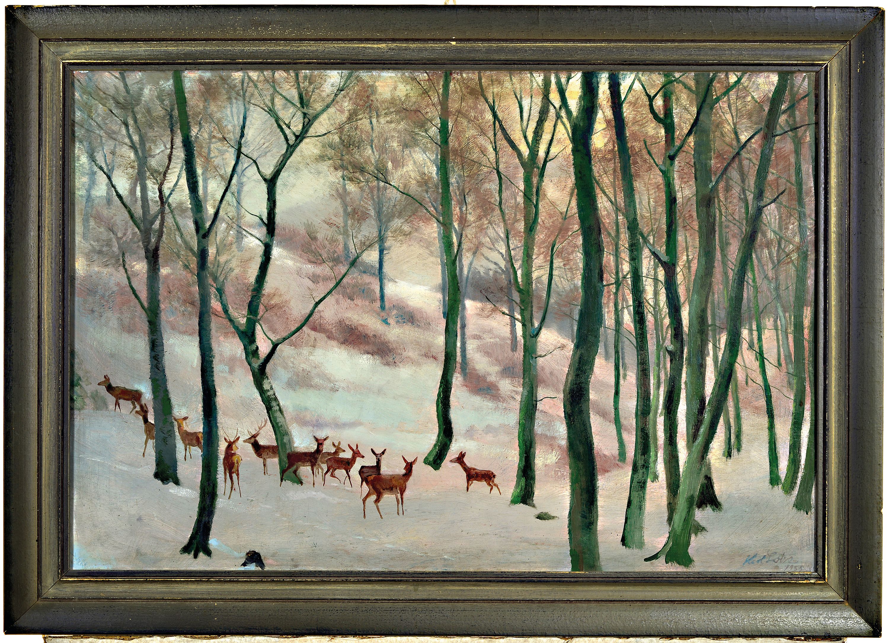 Karl Lotze, 1892-1972, Winterwald mit Rehen, rechts unten signiert und datiert 1935,
