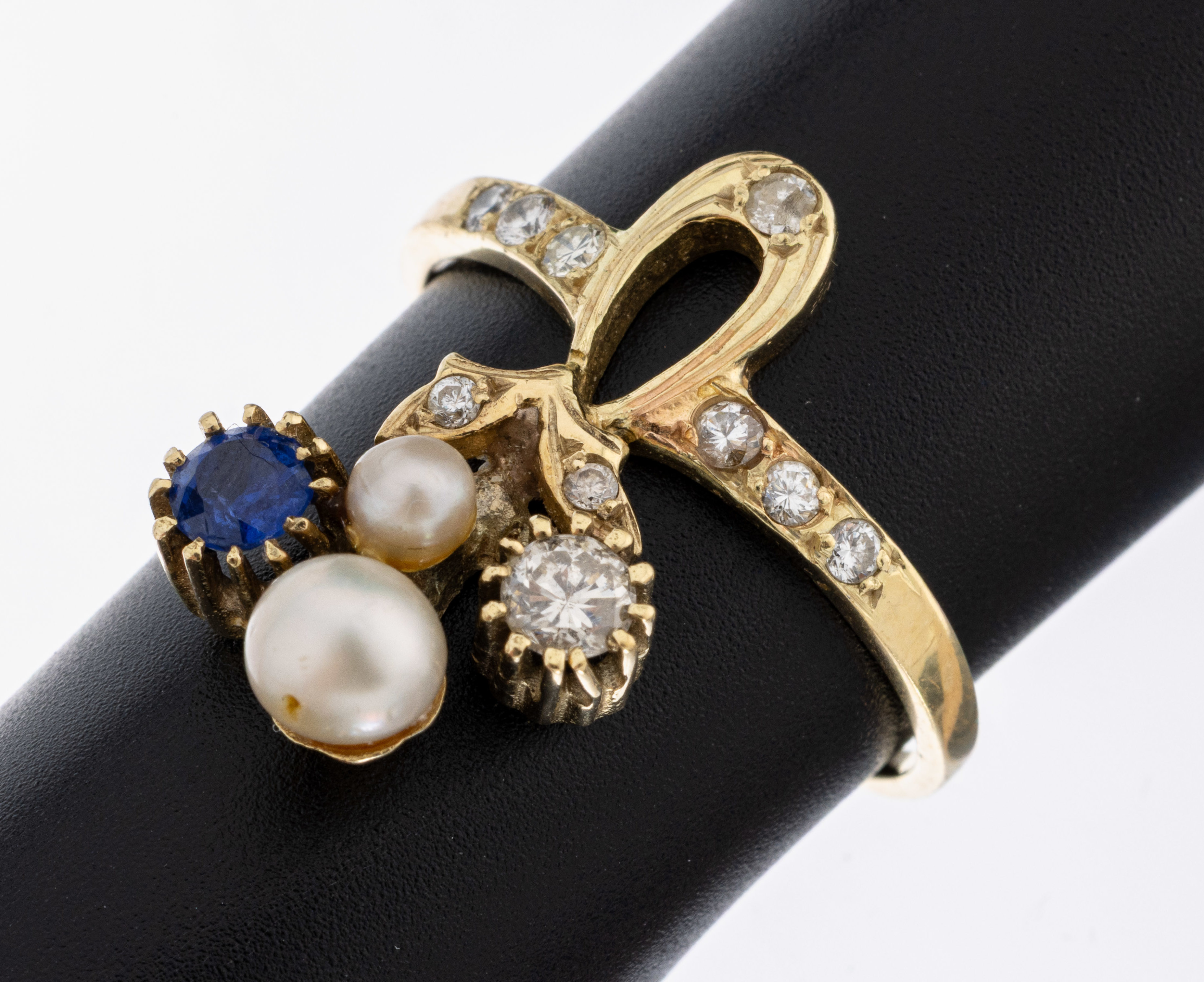 14 kt Gold Brillant-Saphir-Perl-Ring, GG 585/000 gepr., in der Art des Jugendstils,