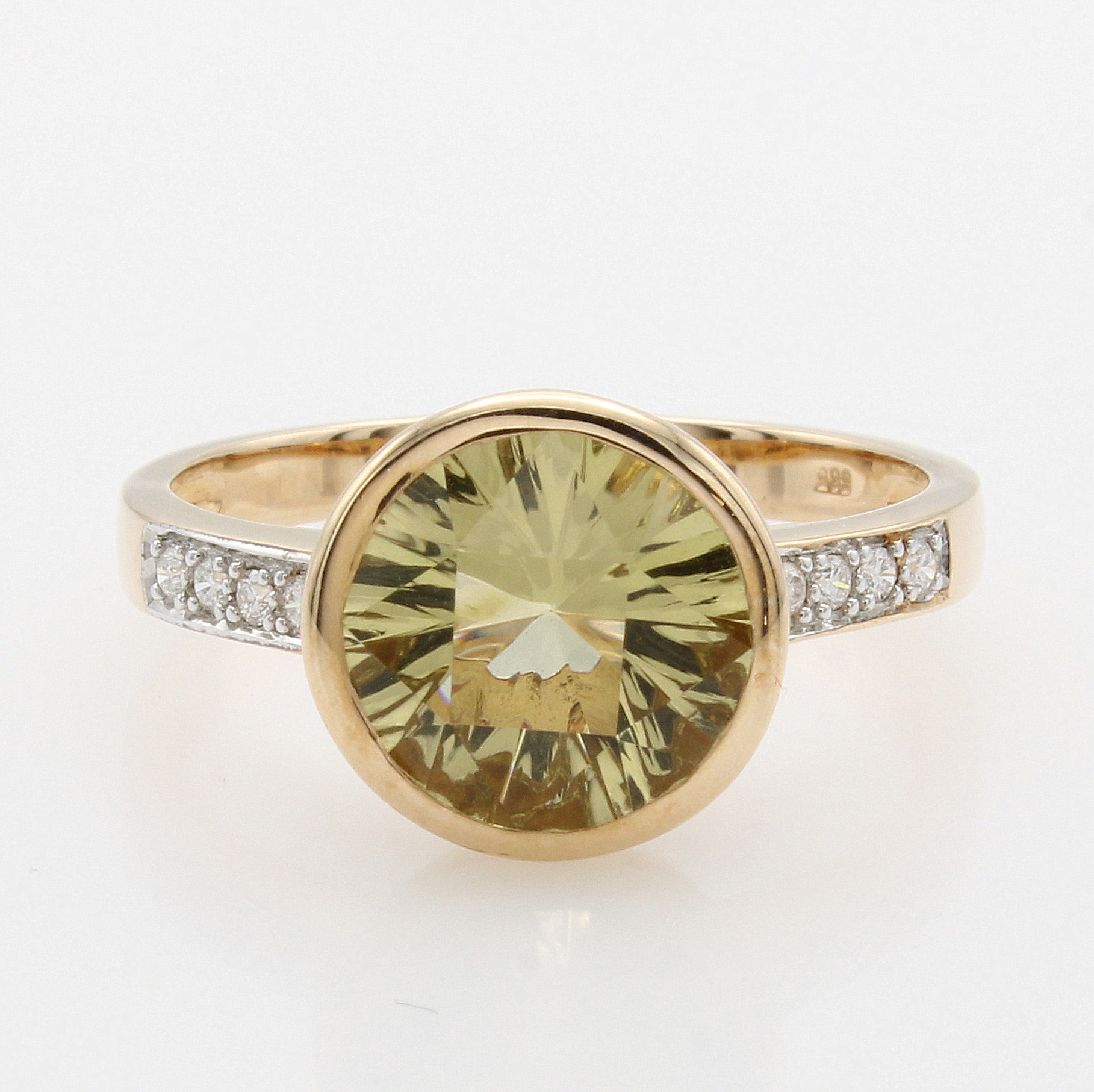 Ring mit Lemoncitrin und Brillanten, RoséG 585/000, Lemoncitrin (beh.) im Sunlight-Cut ca. 2.11 ct, Brill. in Ringschultern zus. ca. 0.06 ct Weiß/si, RW ca. 55 Schätzpreis: 1250, - EUR