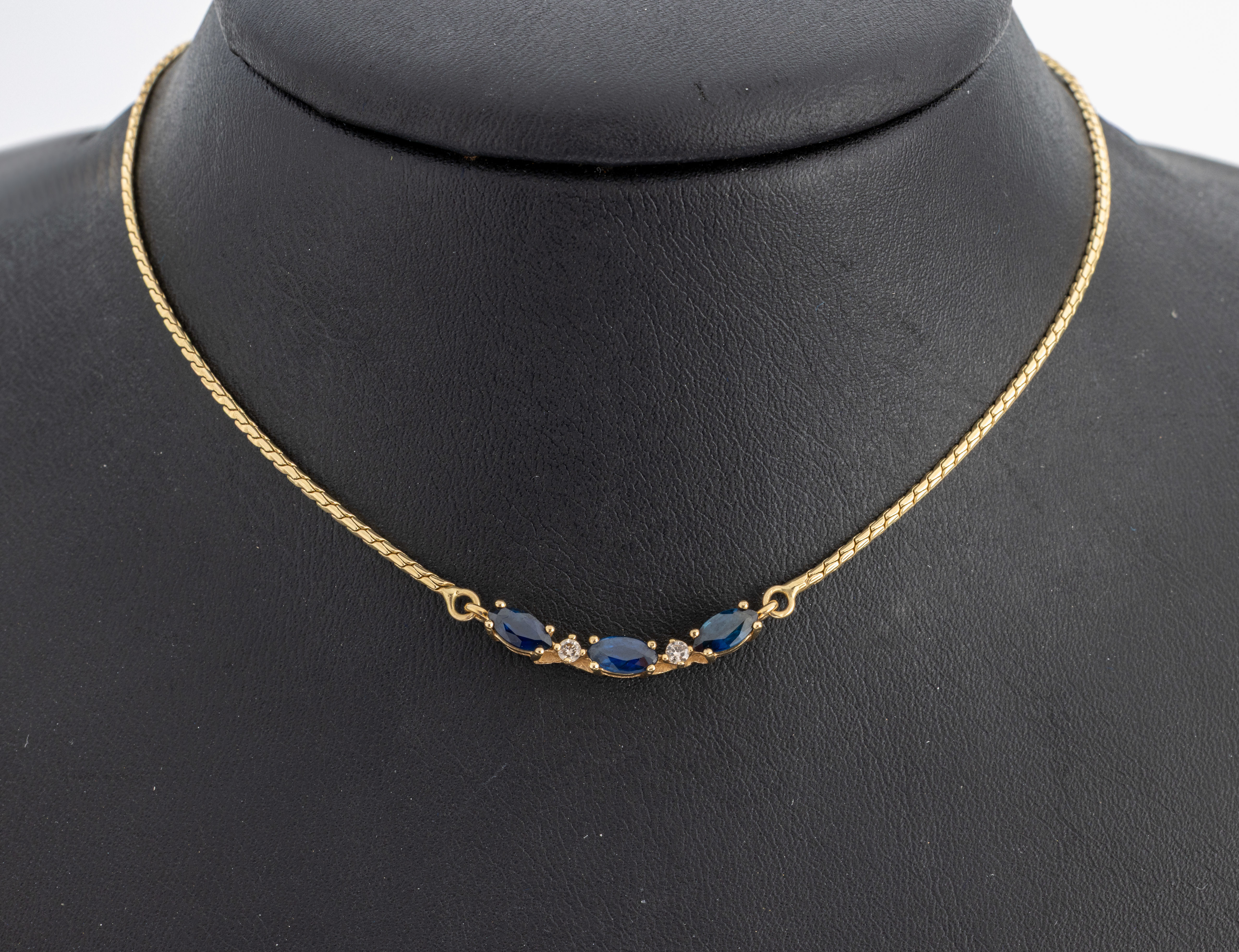 14 kt Gold Saphir-Brillant-Collier, GG 585/000, 3 Saphir-Navettes zus. ca. 0.45 ct,