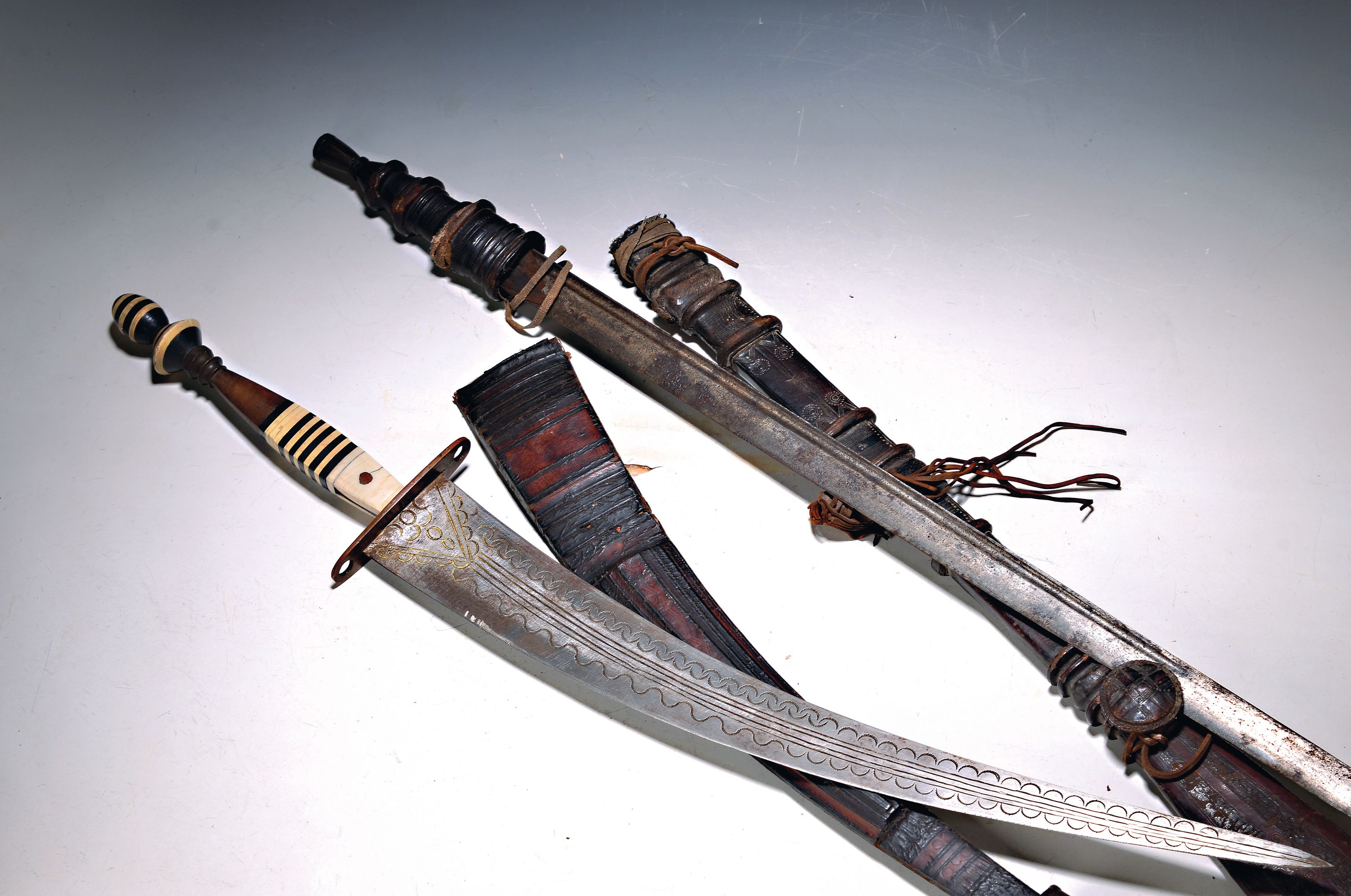 Zwei Schwerter, Nordafrika, 19./20.Jh., Säbel mit gravierter Klinge, Holzgriff mit