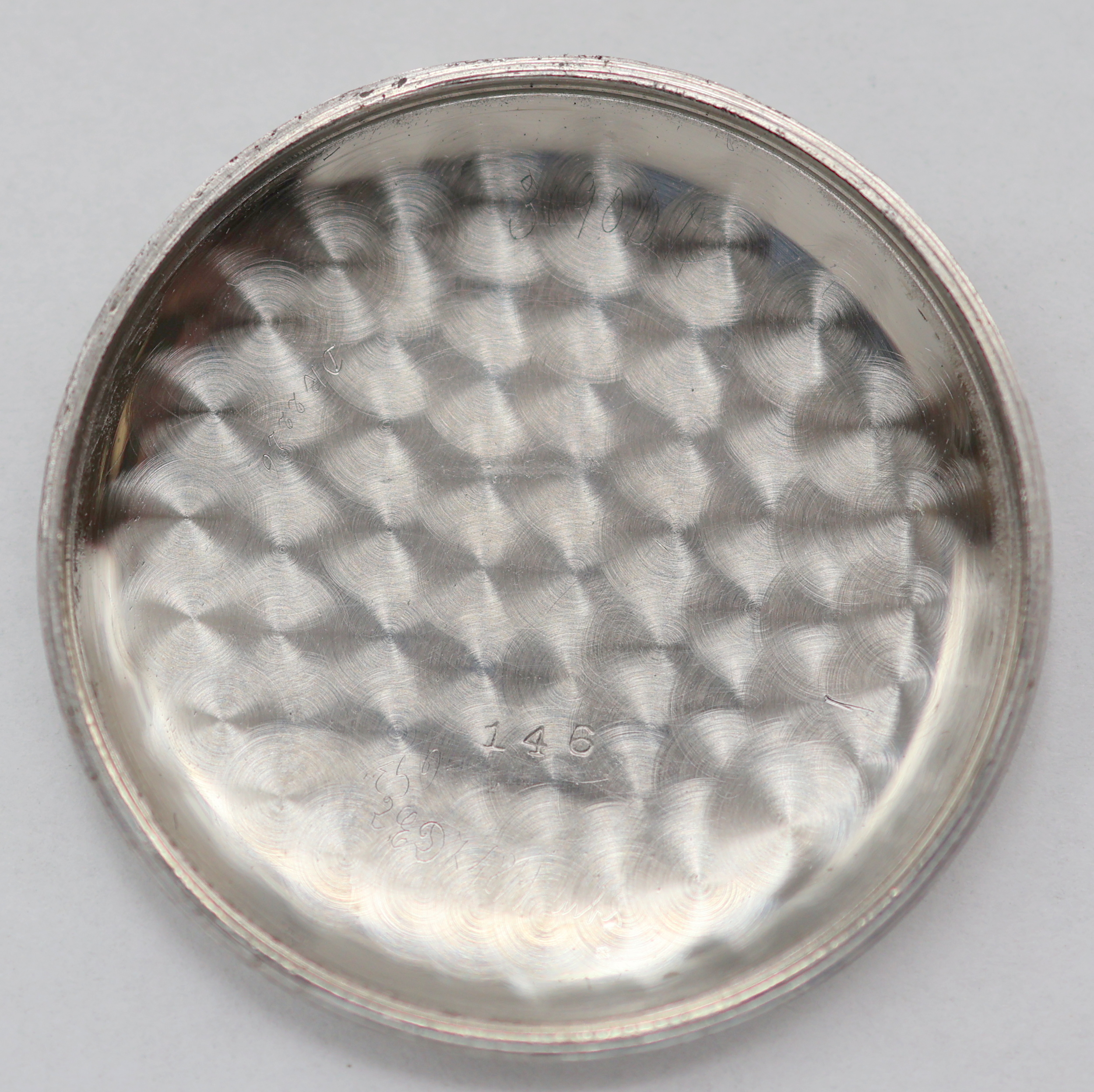 Boden u. Glasrand aufgedr., schwarz/graues Glanz-Zifferbl. pat., Zeiger später,