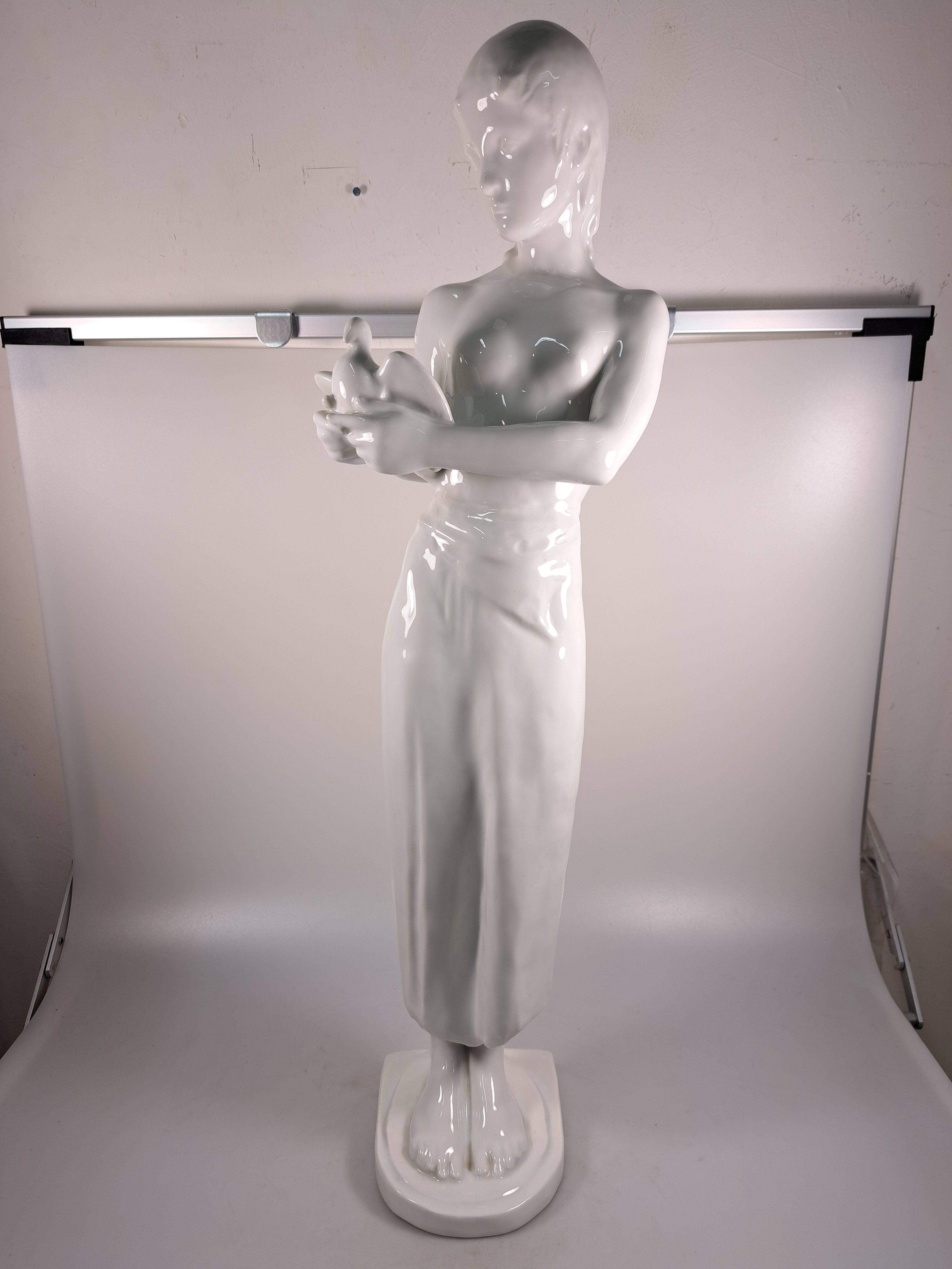 Junge Frau mit Tuch um die Hüfte, eine Taube in der Hand haltend, weiß, sign.,