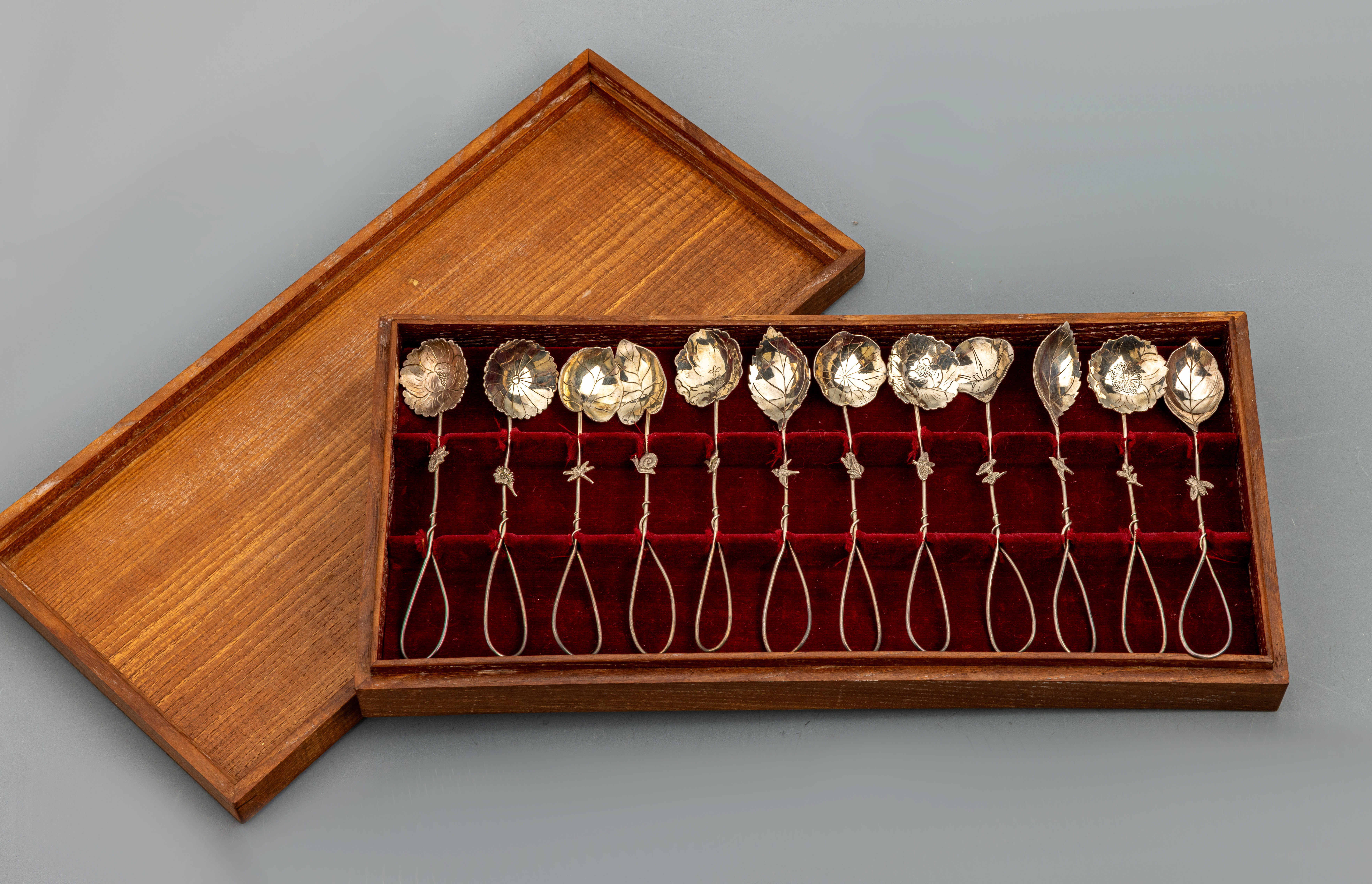 Set 12 Zierlöffel, China, wohl 1960er Jahre, Silber gepr., einfache Verarbeitung,