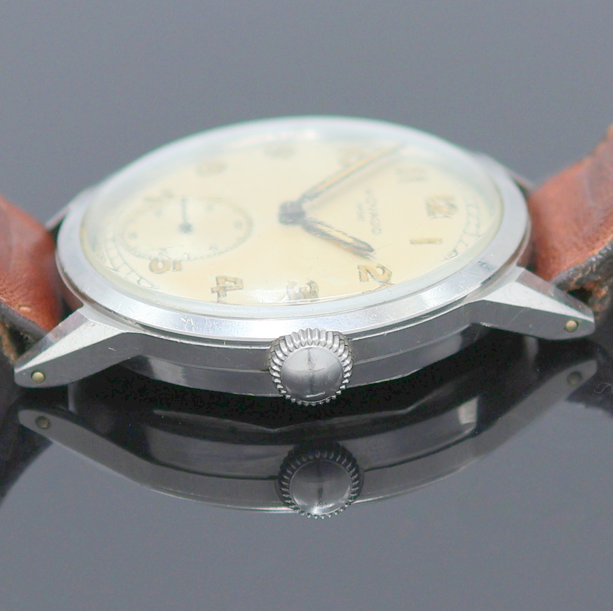 verschr. F.BORGEL Geh., orig. Krone, silb. Zifferbl. pat., arab. Leuchtzahlen, gebl.
