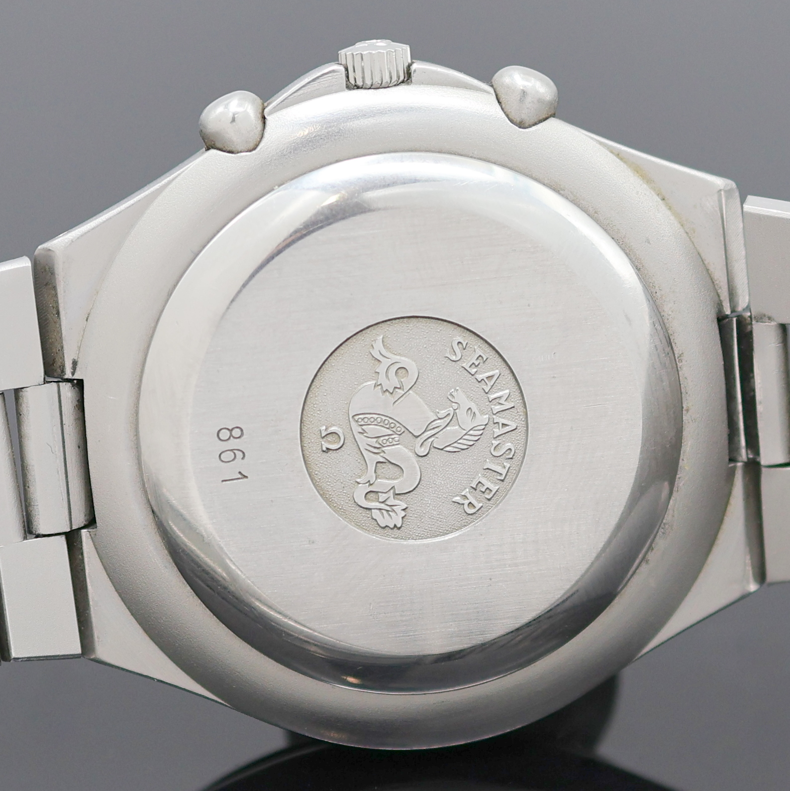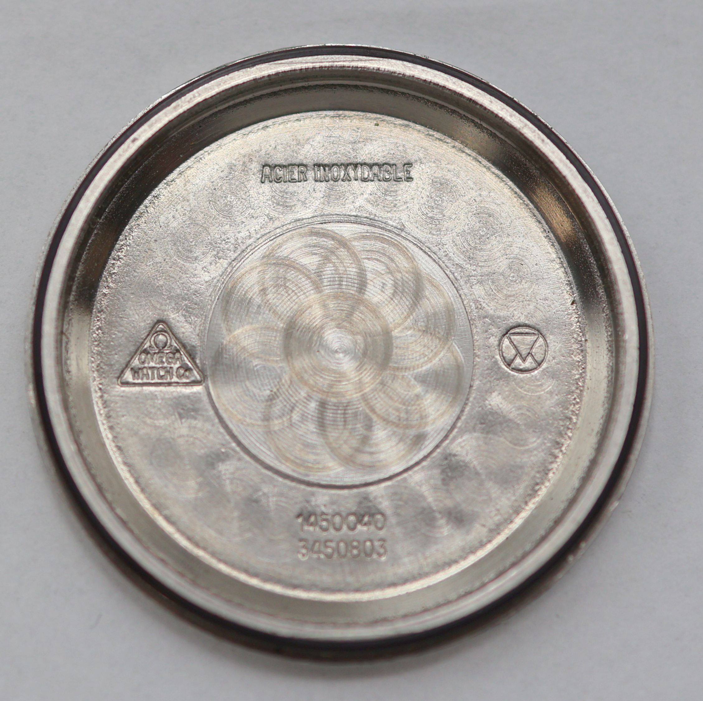 um 1983, Handaufzug, mattiertes Geh. m. integr. Band, Boden m. Seamasterlogo aufgedr.,