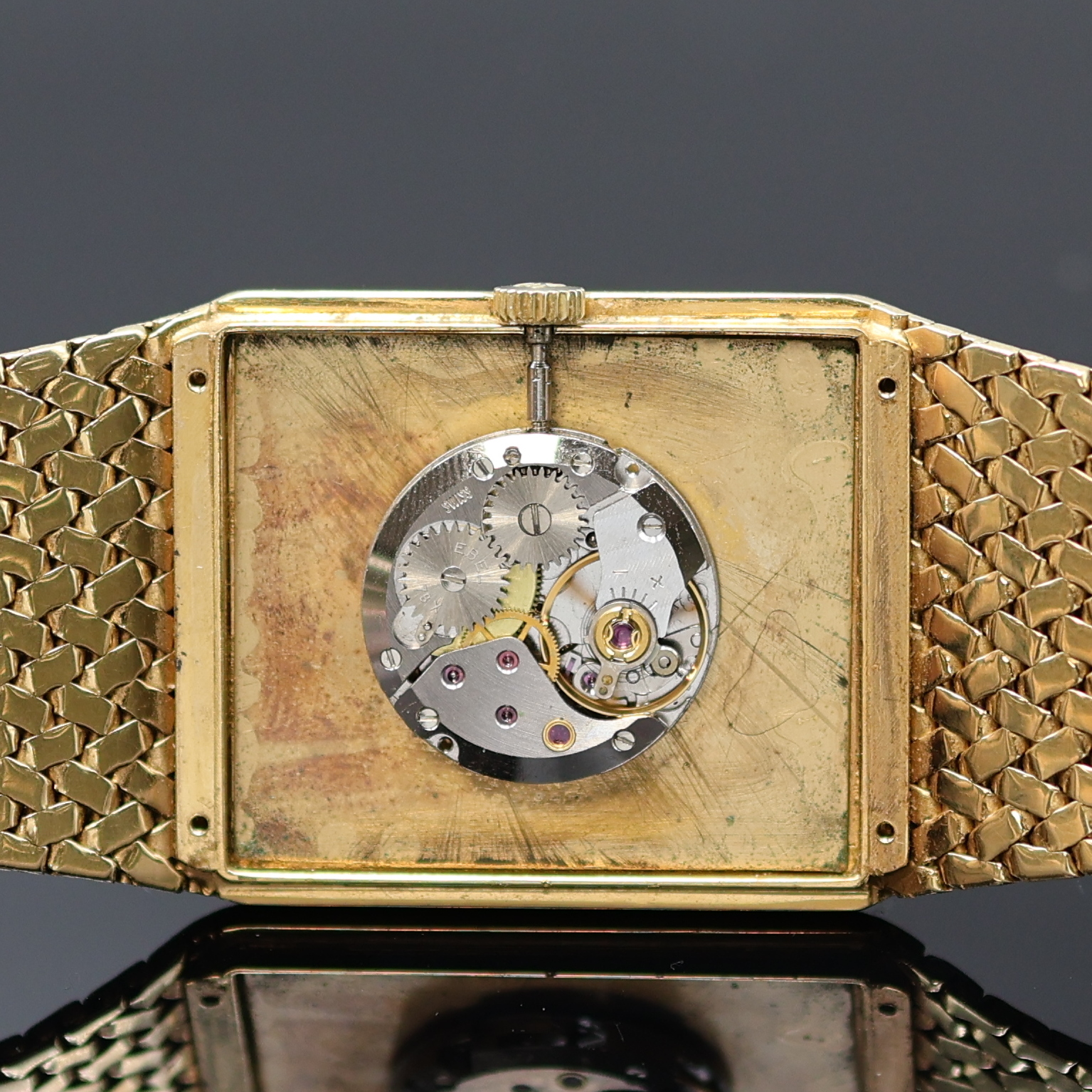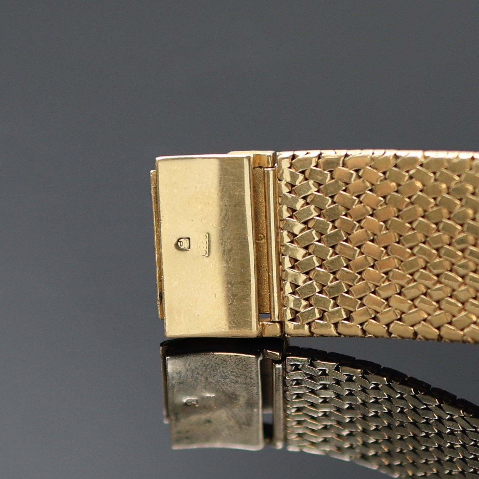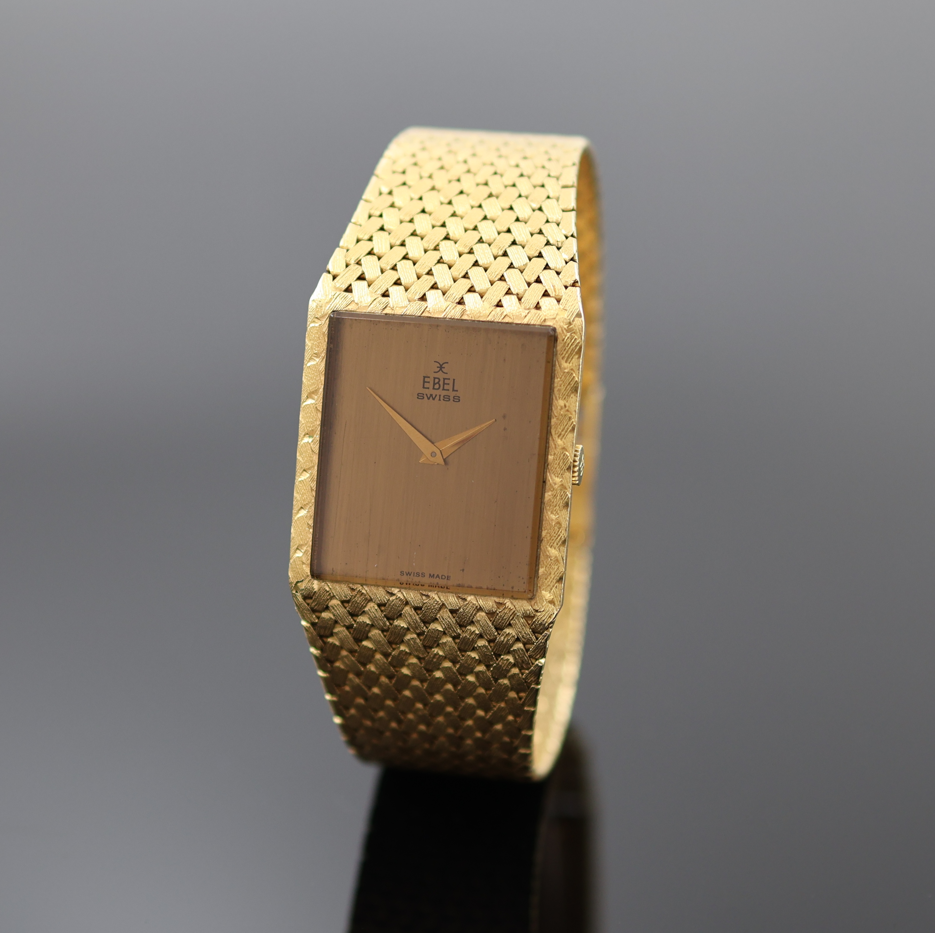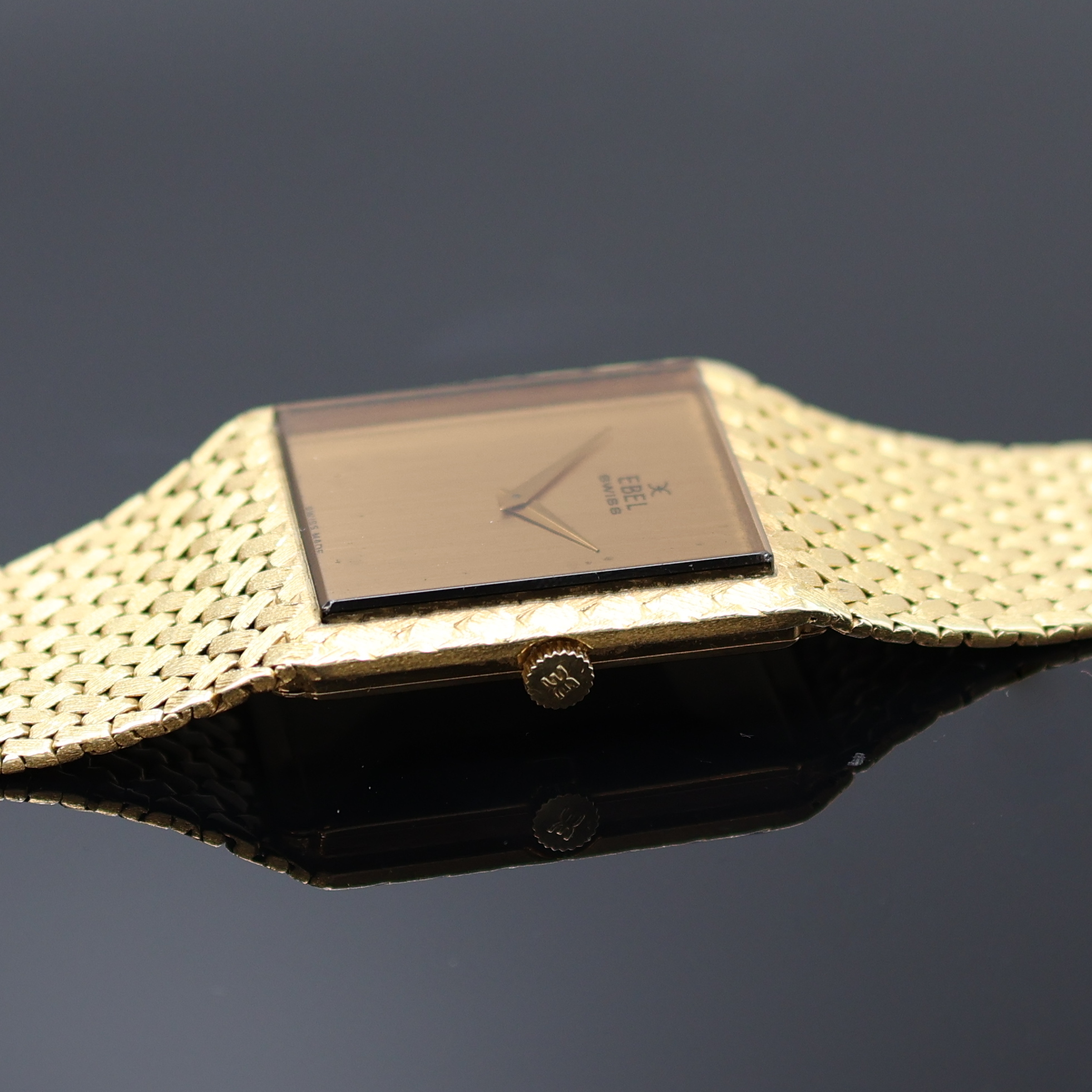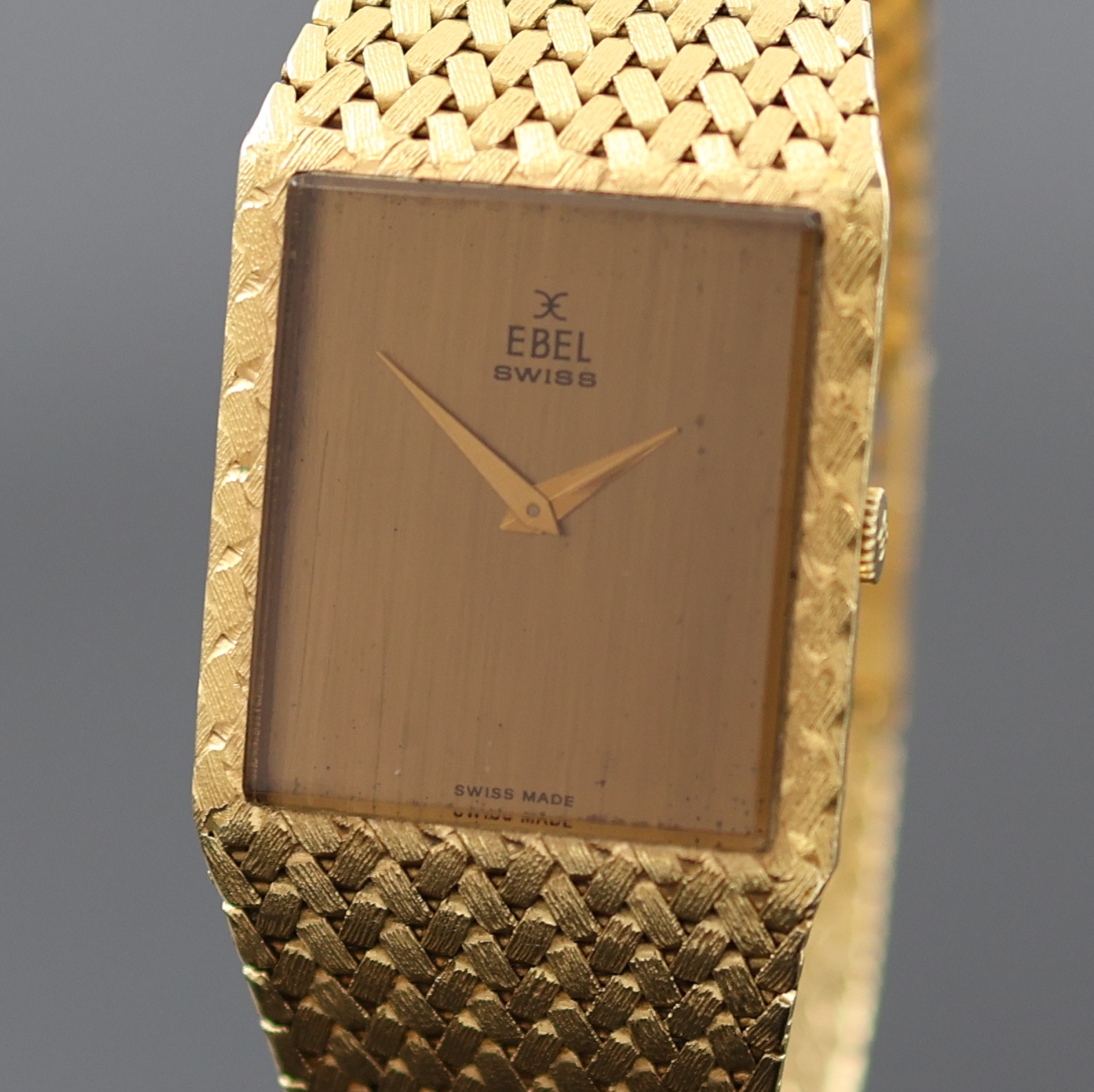 EBEL ausgefallene und schwere Herrenarmbanduhr in GG 750/000, Schweiz um 1975, Handaufzug, 2-tlg. Geh., Boden 4-fach verschr., integr. Milanaiseband, gold. Zifferbl., gold. Dauphinezeiger, rhod. Werk Kal. 78X (ETA 2512) m. Genfer Streifen, 17 St., D. ca. 31 mm, L. ca. 19 cm, Gew. ca. 104g, EZ 2
