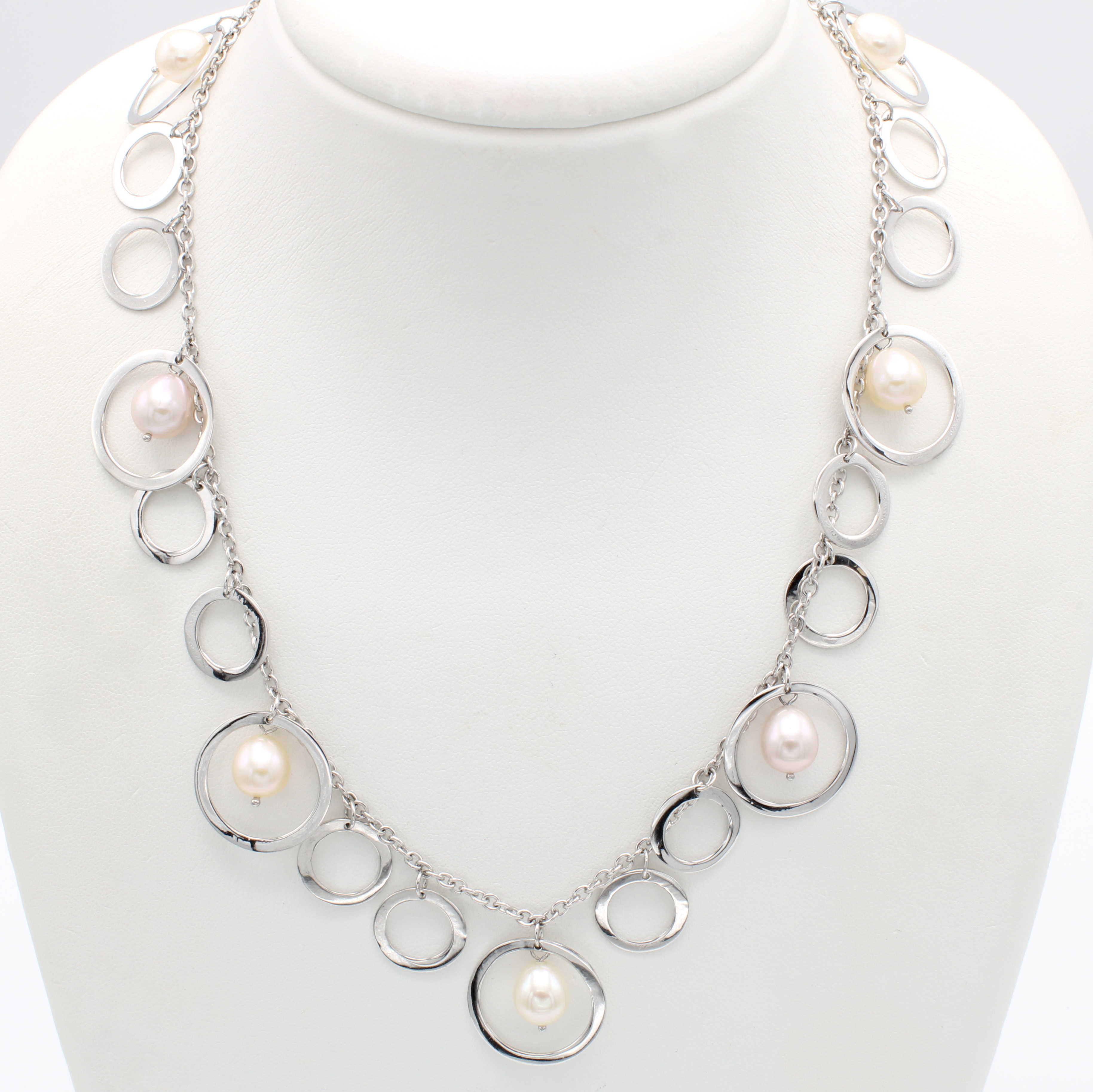 Gliederkette mit Süßwasserzuchtperlen, 925erSilber, Ringe als Abhängungen in versch. Größen, multicolorfarb. Perlen ca. 8.5 mm, Knebelschl., L. ca. 40-43 cm