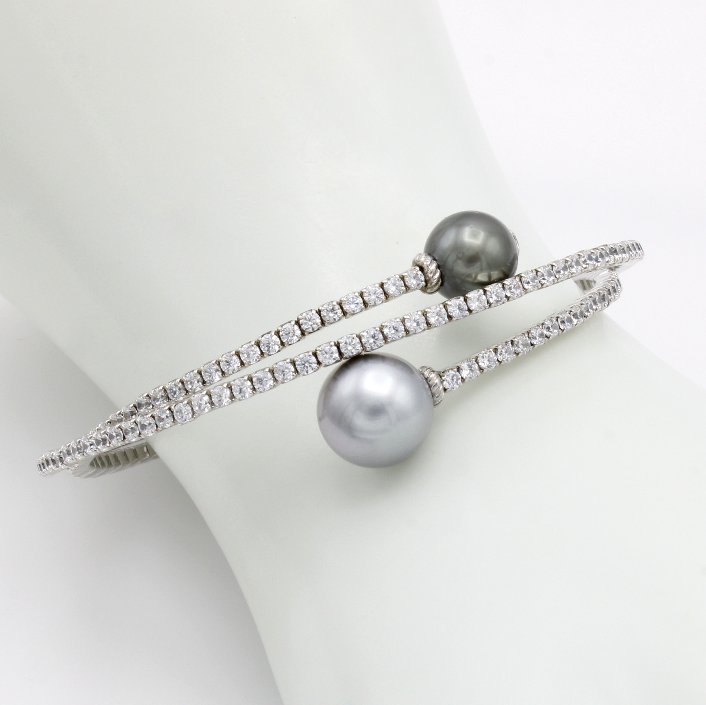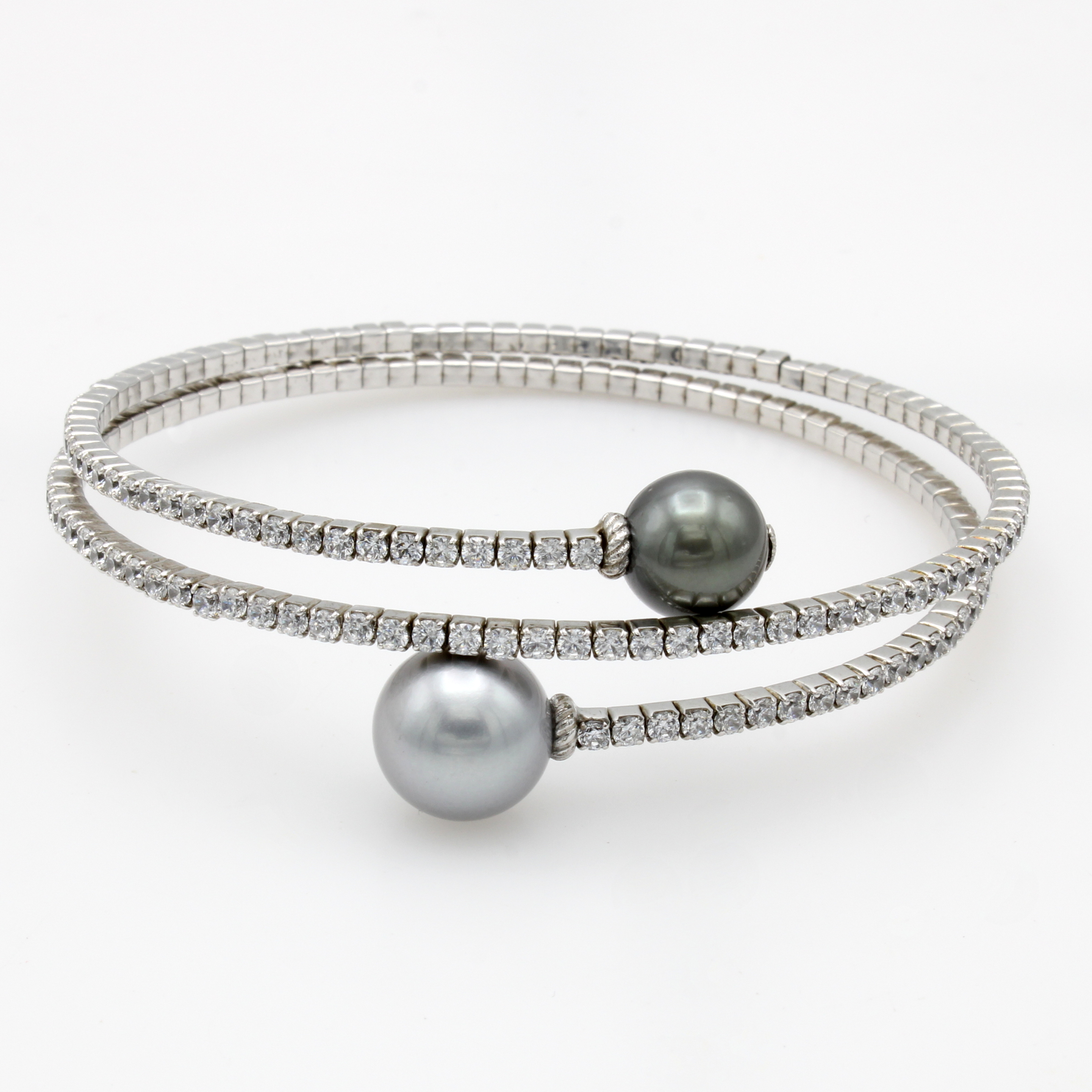 Flexible Armspange mit Tahitiperlen und Zirkonia, 925er Silber, 3-rhg. Design, voll besetzt. m. fac. Zirkonias, hellgraue Perle ca. 11 mm, dunkelgrüne-graue Perle ca. 9 mm