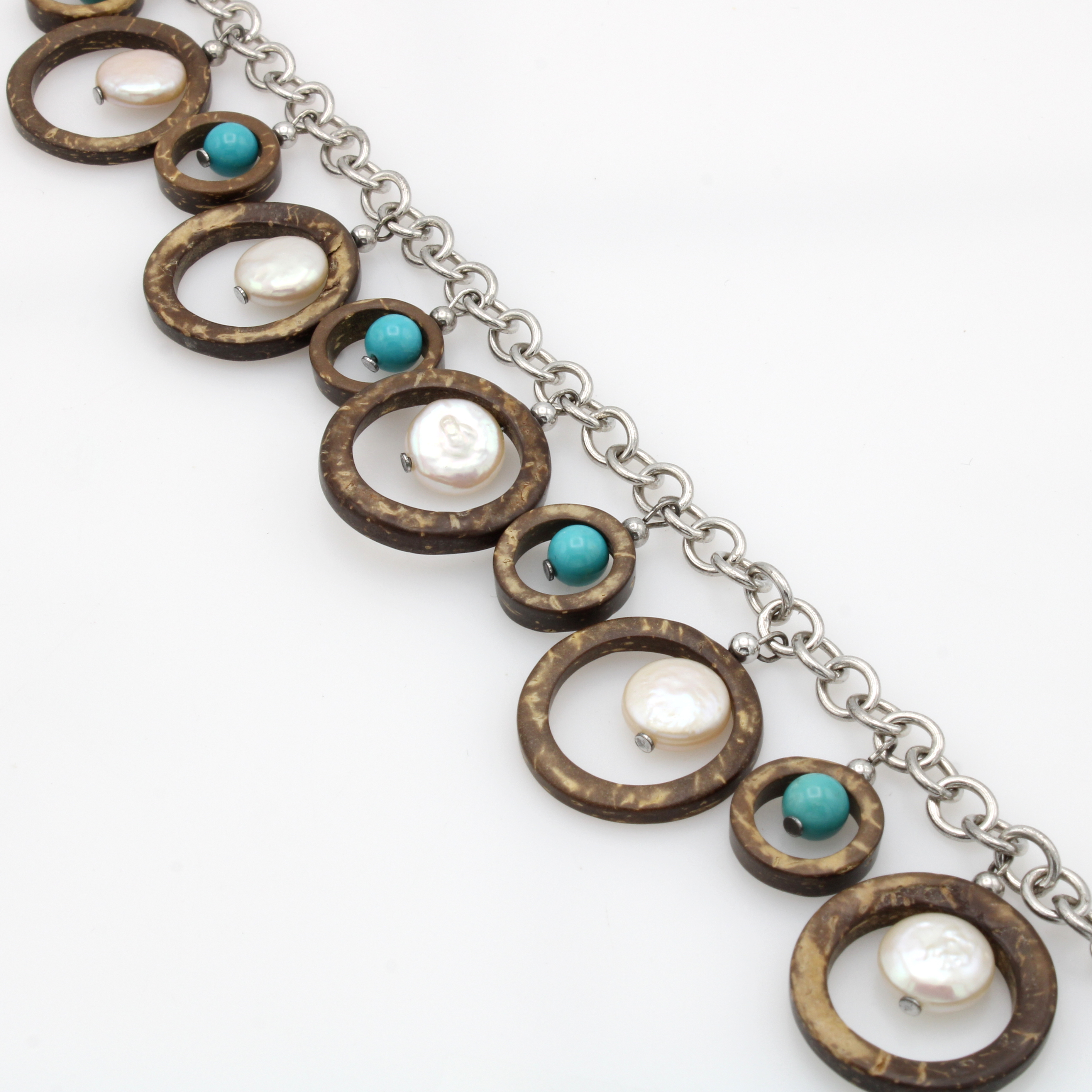 Armband mit Perlen, Türkisen und Holz, 925er Silber, Holzringe als Abhängungen, Türkiskugeln, flache Süßwasserperlen, L. ca. 20.5 cm