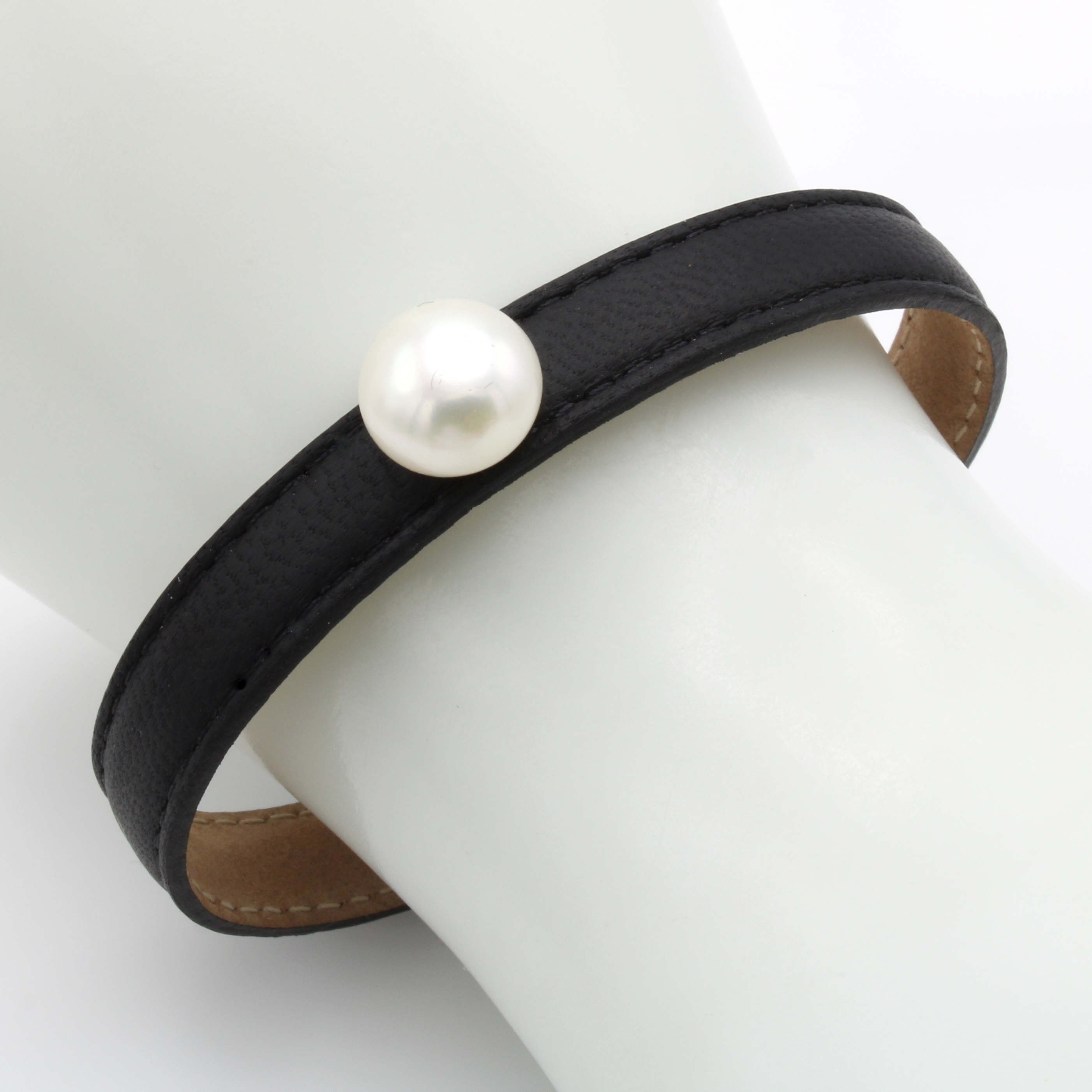 Armspange mit Süßwasserperle, Endkappen 925er Silber, schwarzes Leder, bouttonf. Perleca. 10 mm