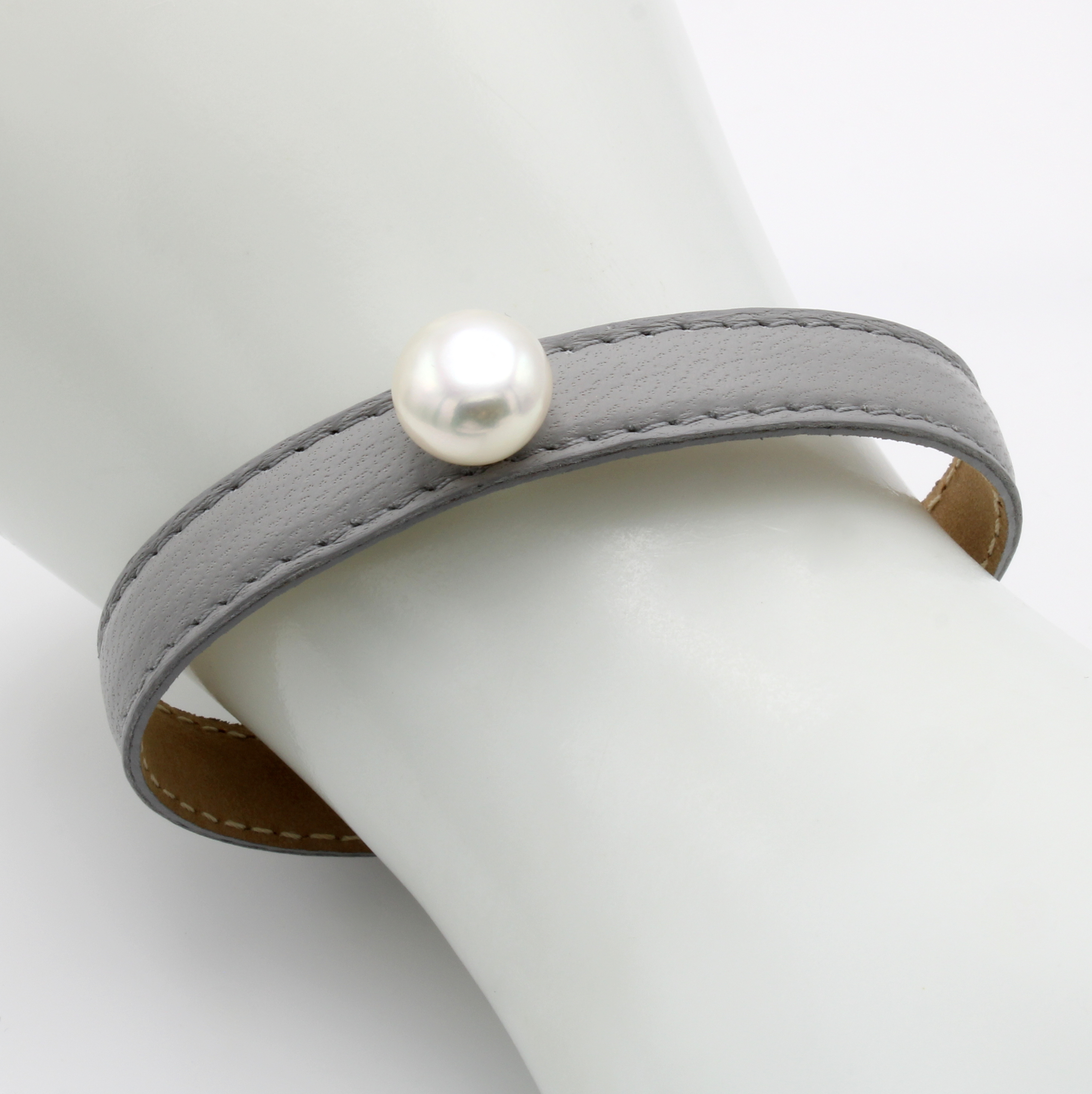 Armspange mit Süßwasserperle, Endkappen 925er Silber, graues Leder, bouttonf. Perle ca. 10 mm