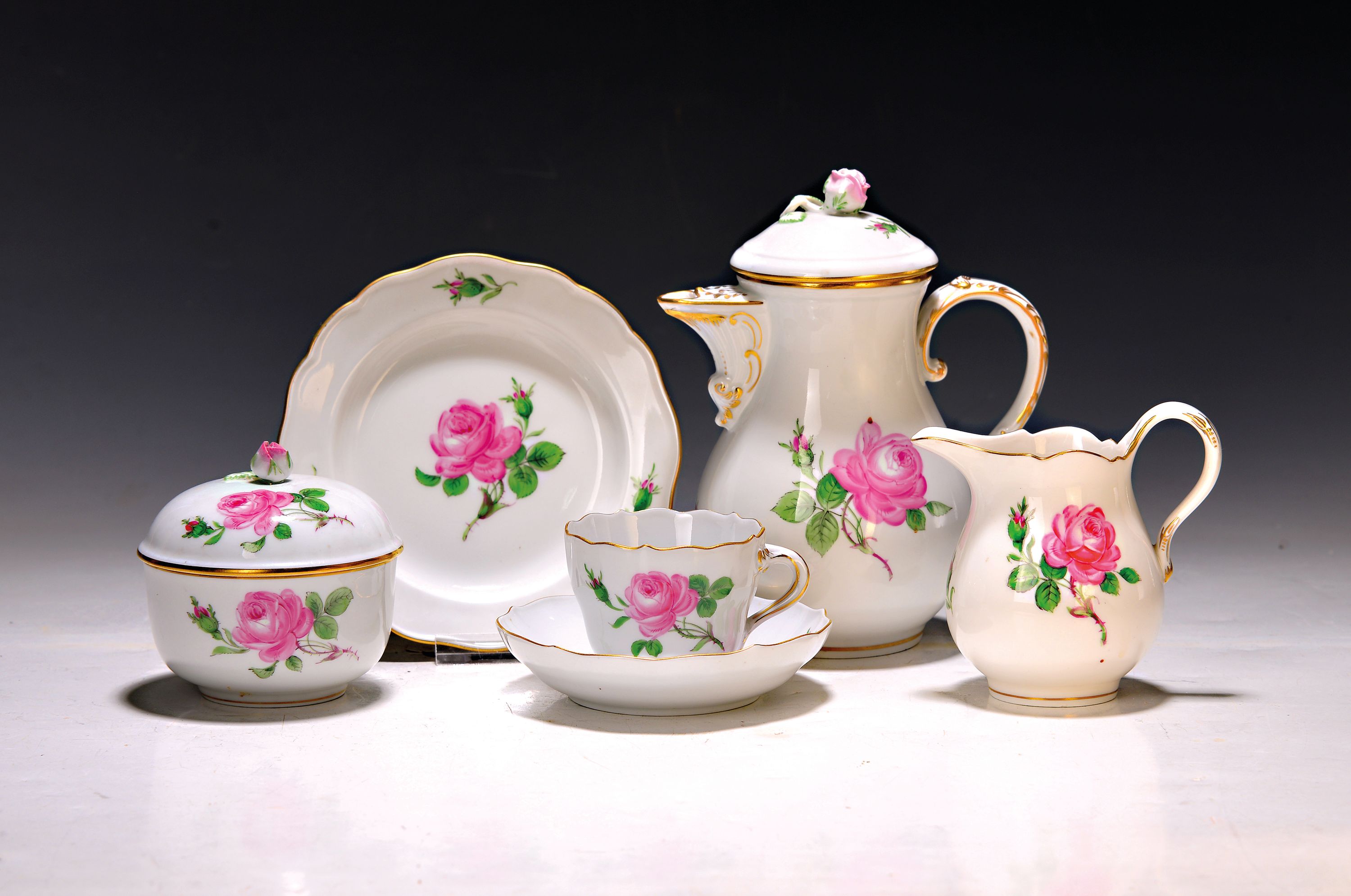 7 Teller D. 13,5 cm, 7 Tassen mit 5 UT, Sahnegießer und Zuckerdose, Kännchen (Deckelrose