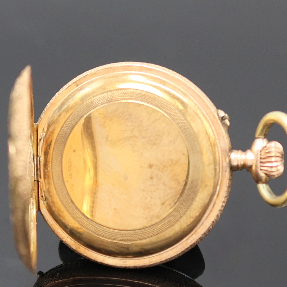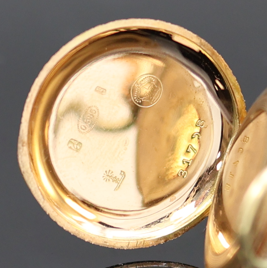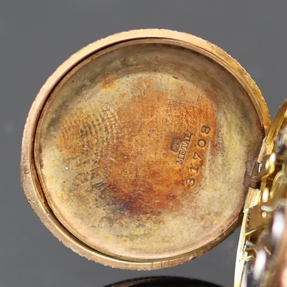 grav. 2- Deckel Goldgeh., verg. Metallcuvette, Emailzifferbl. m. röm. Std. u. goldgep.