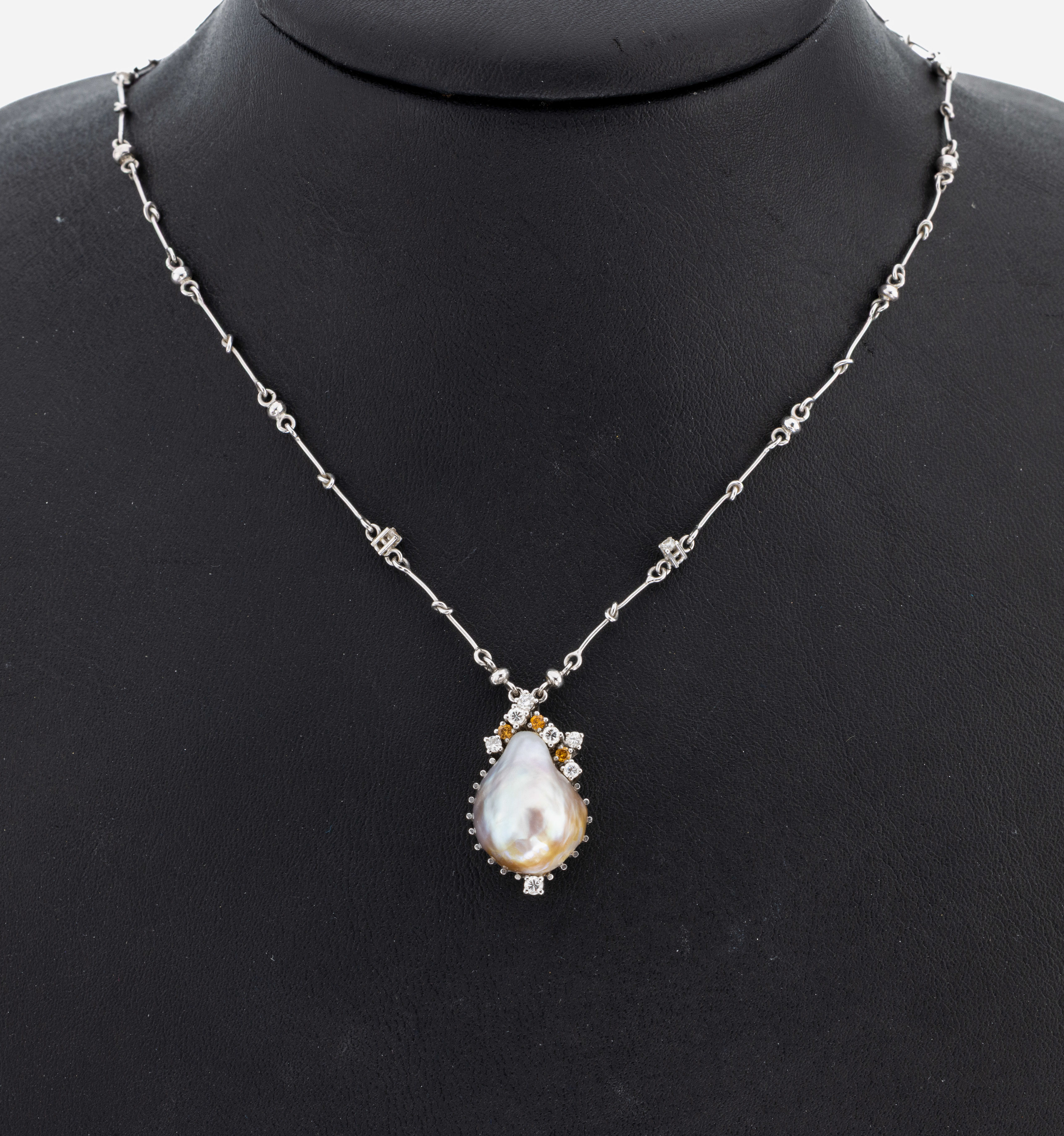 18 kt Gold Perl-Brillant-Collier, GG 750/000, barocke tropfenförm. Südseezuchtperle