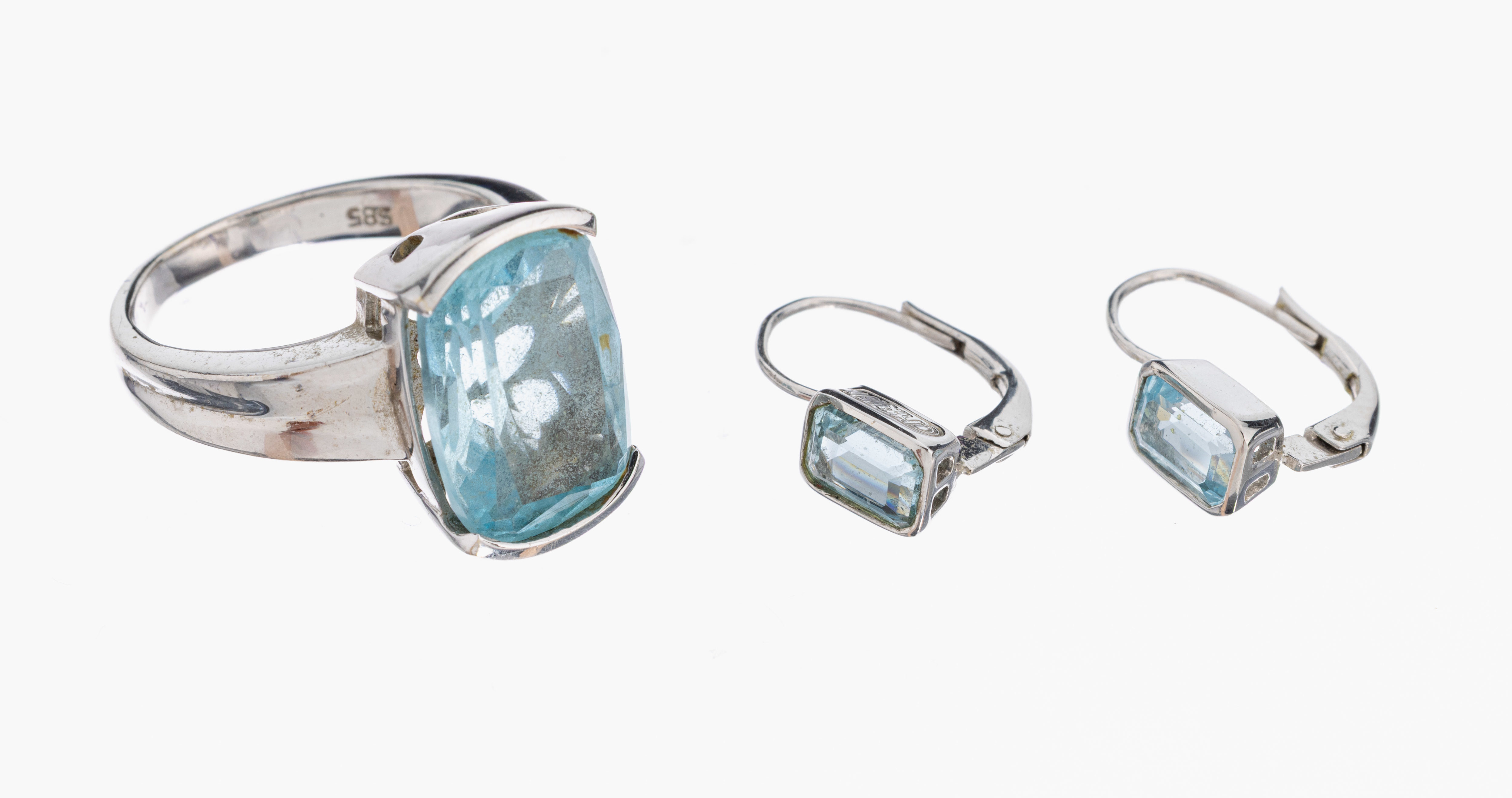 14 kt Gold Blautopas-Schmuckset, WG 585/000, best. aus: Ring, RW 52, dazu Paar CHRIST