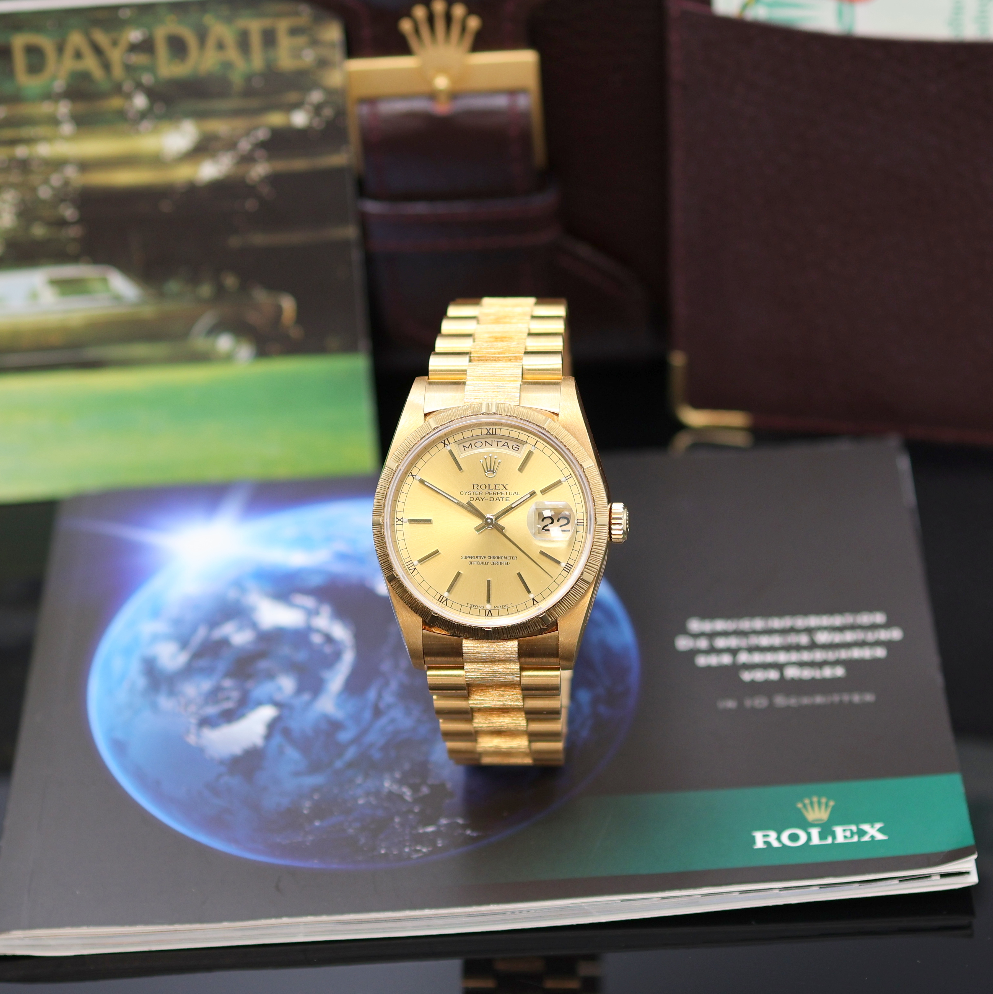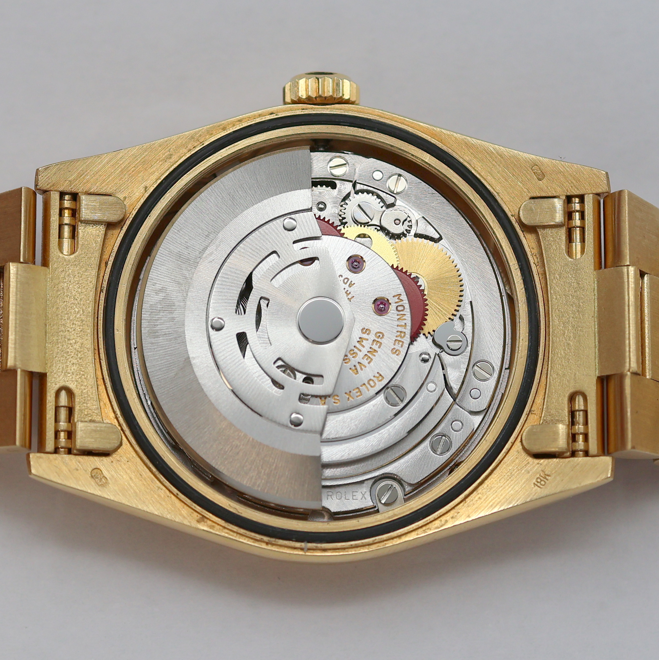 ROLEX selten gut erhaltene Oyster Perpetual Day-Date Herrenarmbanduhr in GG 750/000 Referenz 18248, Schweiz verk. lt. beil. Zertifikat 03/1995, Automatik, X-Serie, LC 100, Chronometer der Superlative, verschr. Oystergeh. inkl. Präsidentband m. Rindengravur, Indexlünette, Faltschl., champagnerfarbenes Zifferbl. m. röm. Zahlen und aufges. Indizes, gold. Zeiger, Datum unter Lupenglas, Kal. 3155, dopp. Schnellschaltung, D. ca. 36 mm, L. ca. 19,5 cm, orig. Rolex Box, Pap. und Rolex Servicenachweis von 11/2012 anbei, EZ 1-2