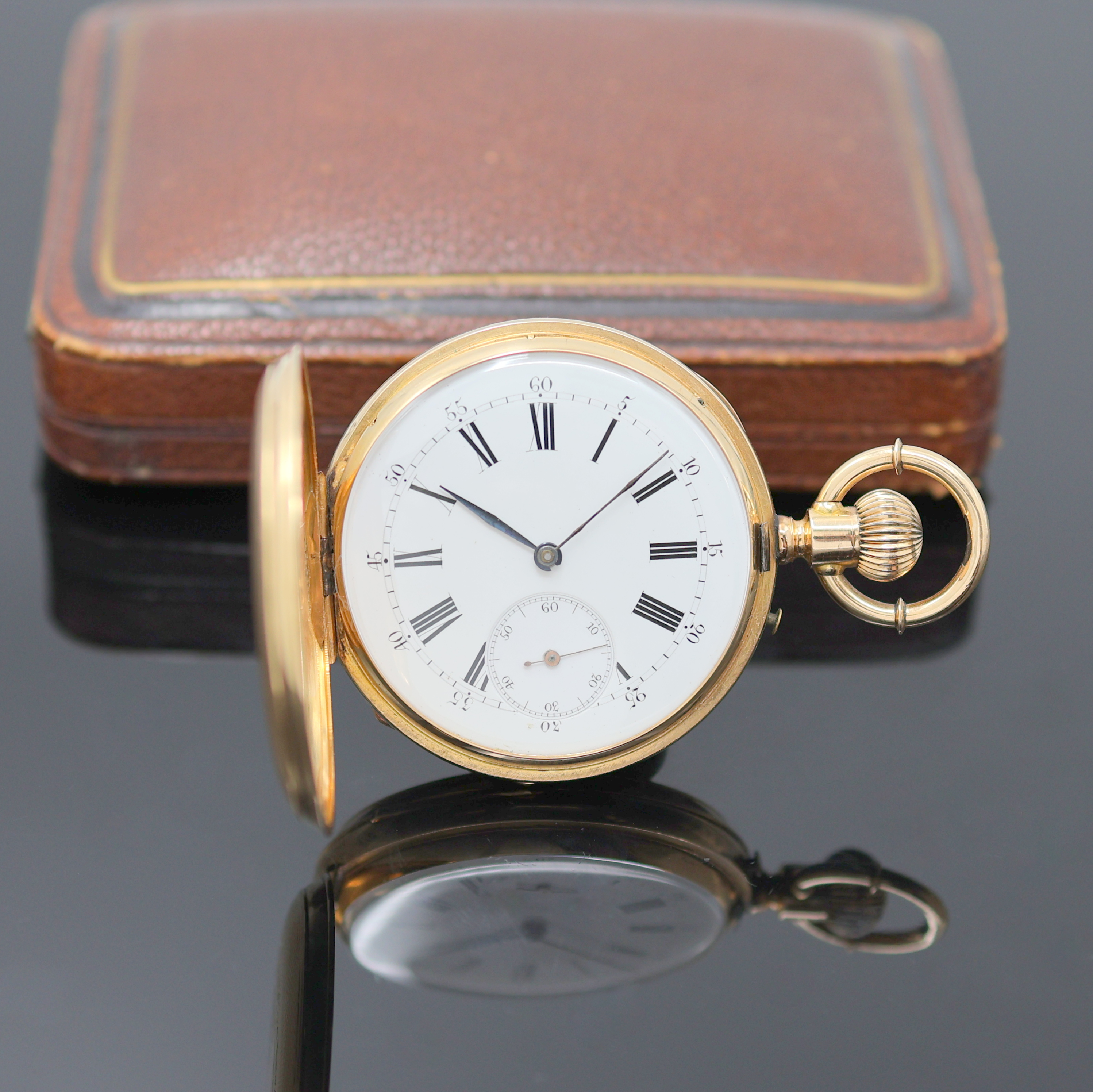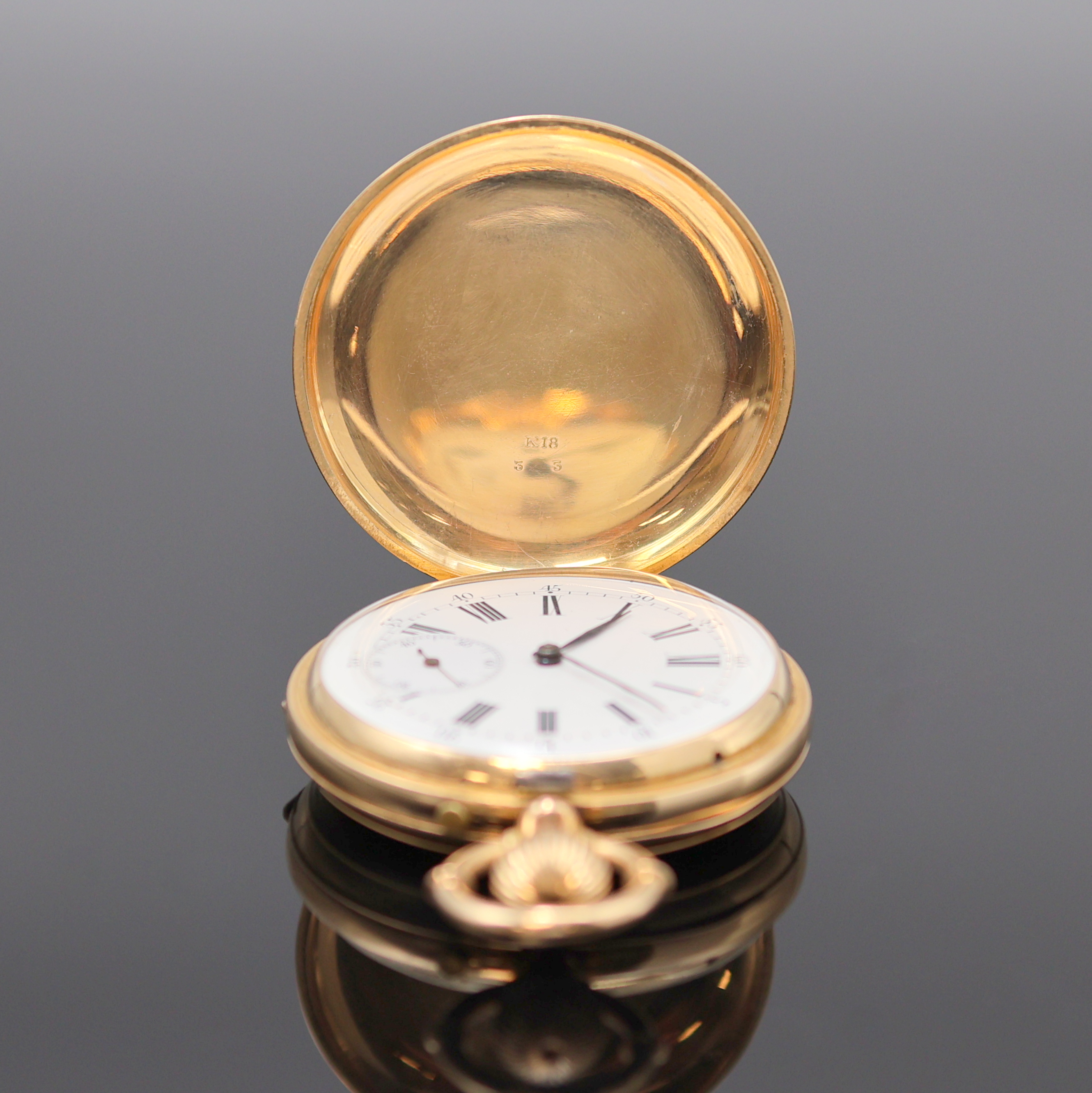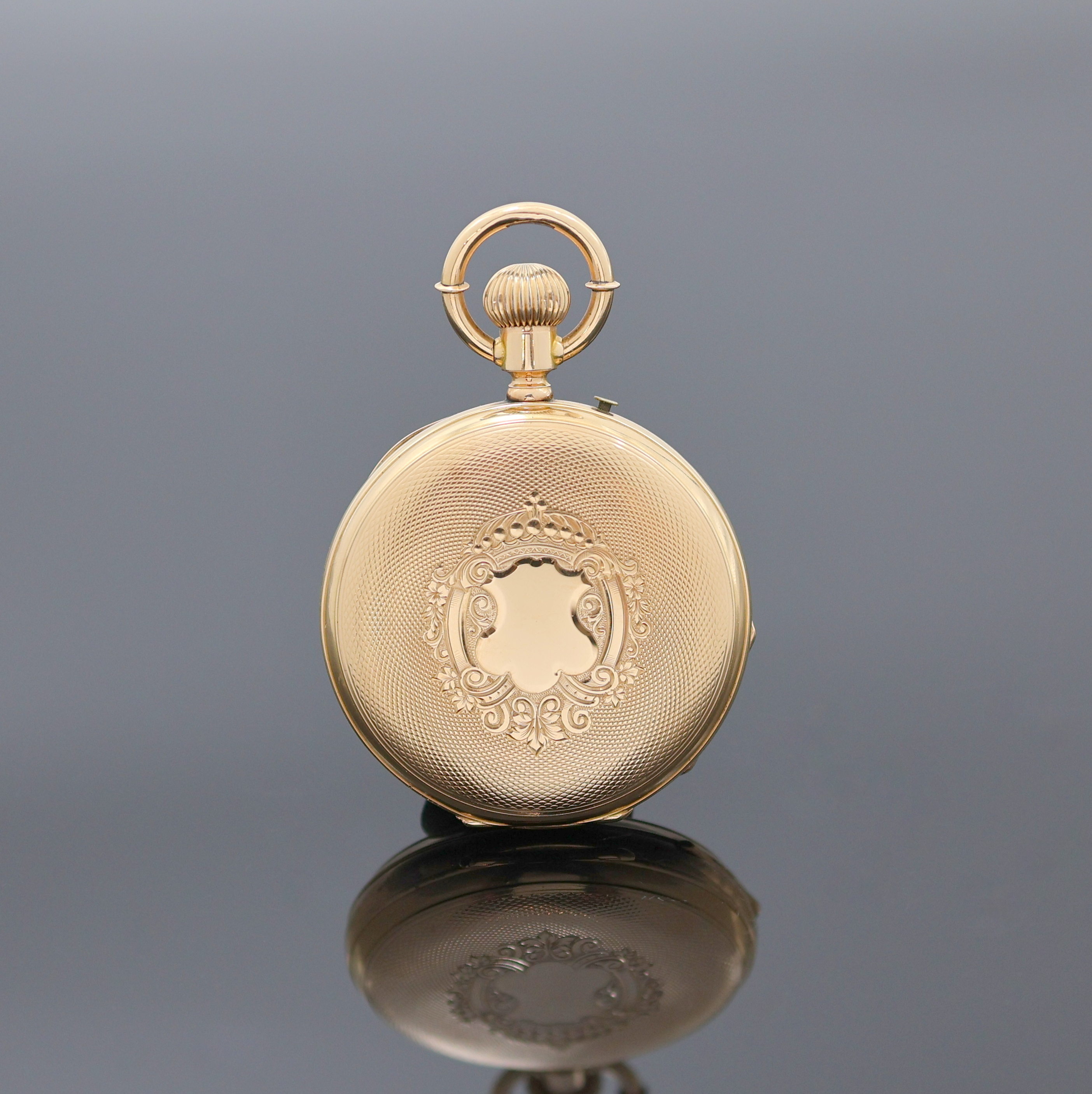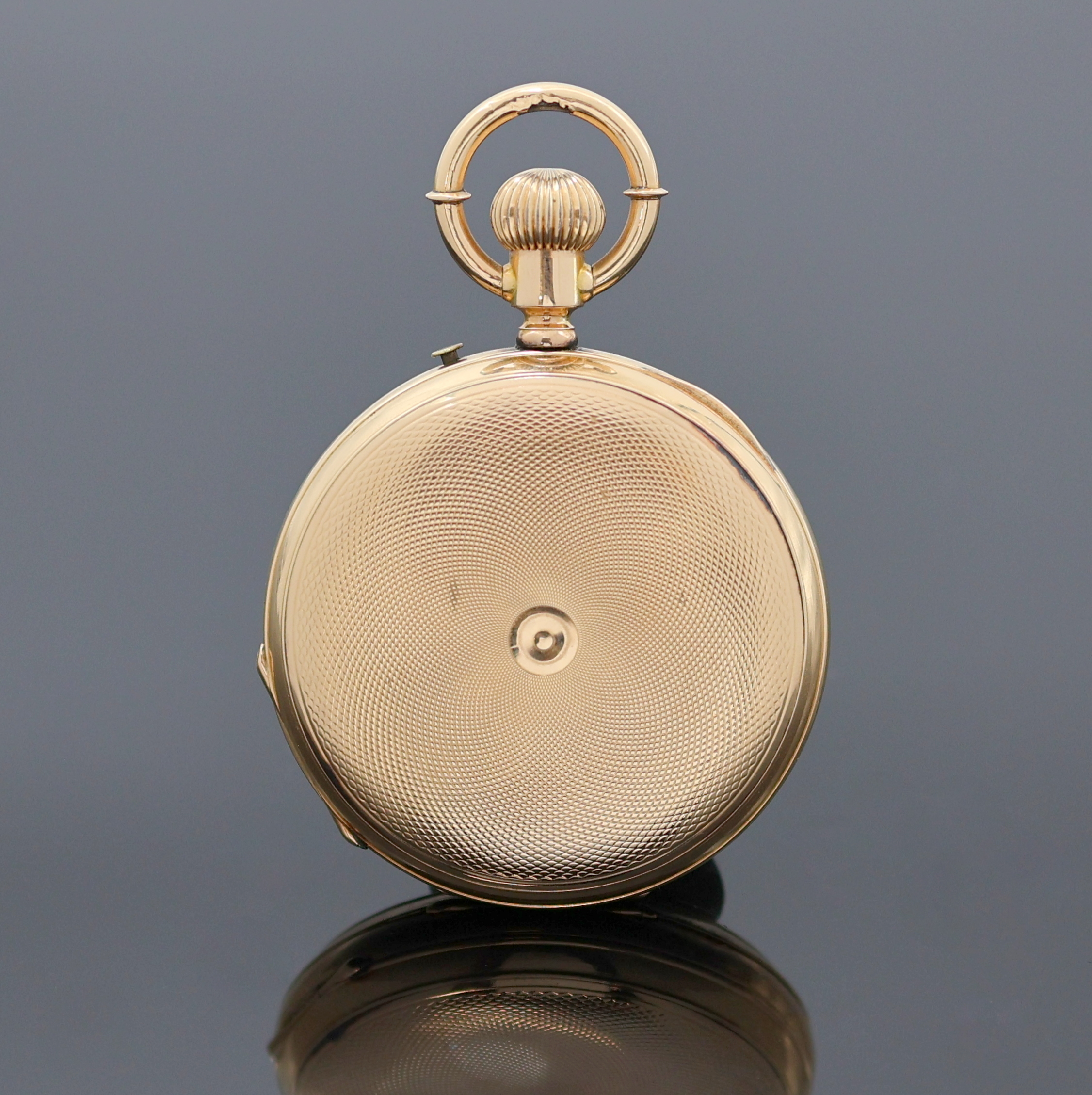 1890, aufw. grav. und guill. 3-Deckel Goldgeh., Saturnring-Bügel, Emailzifferbl.