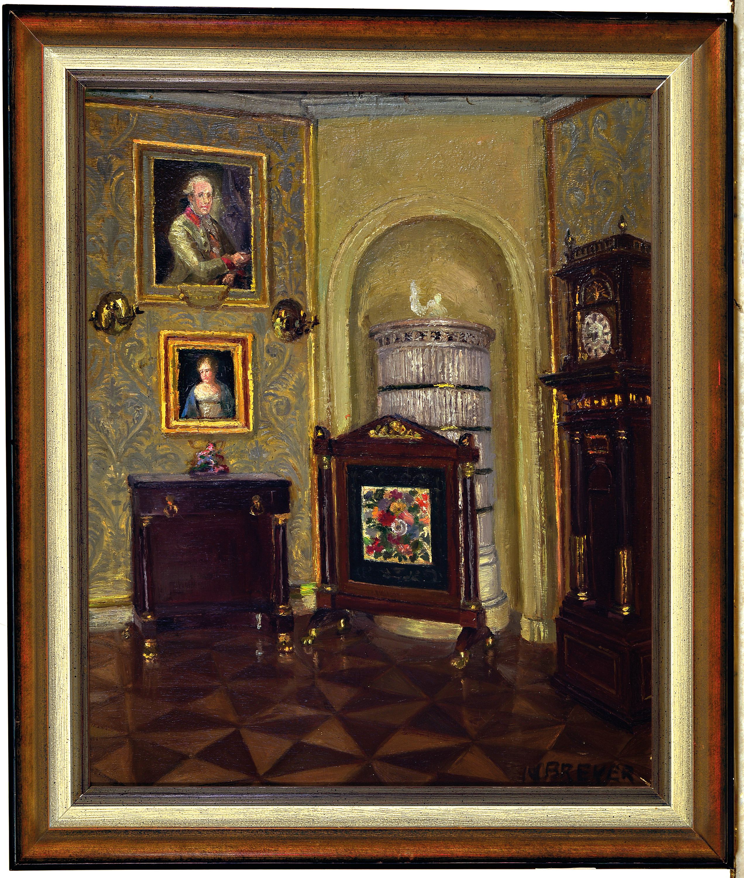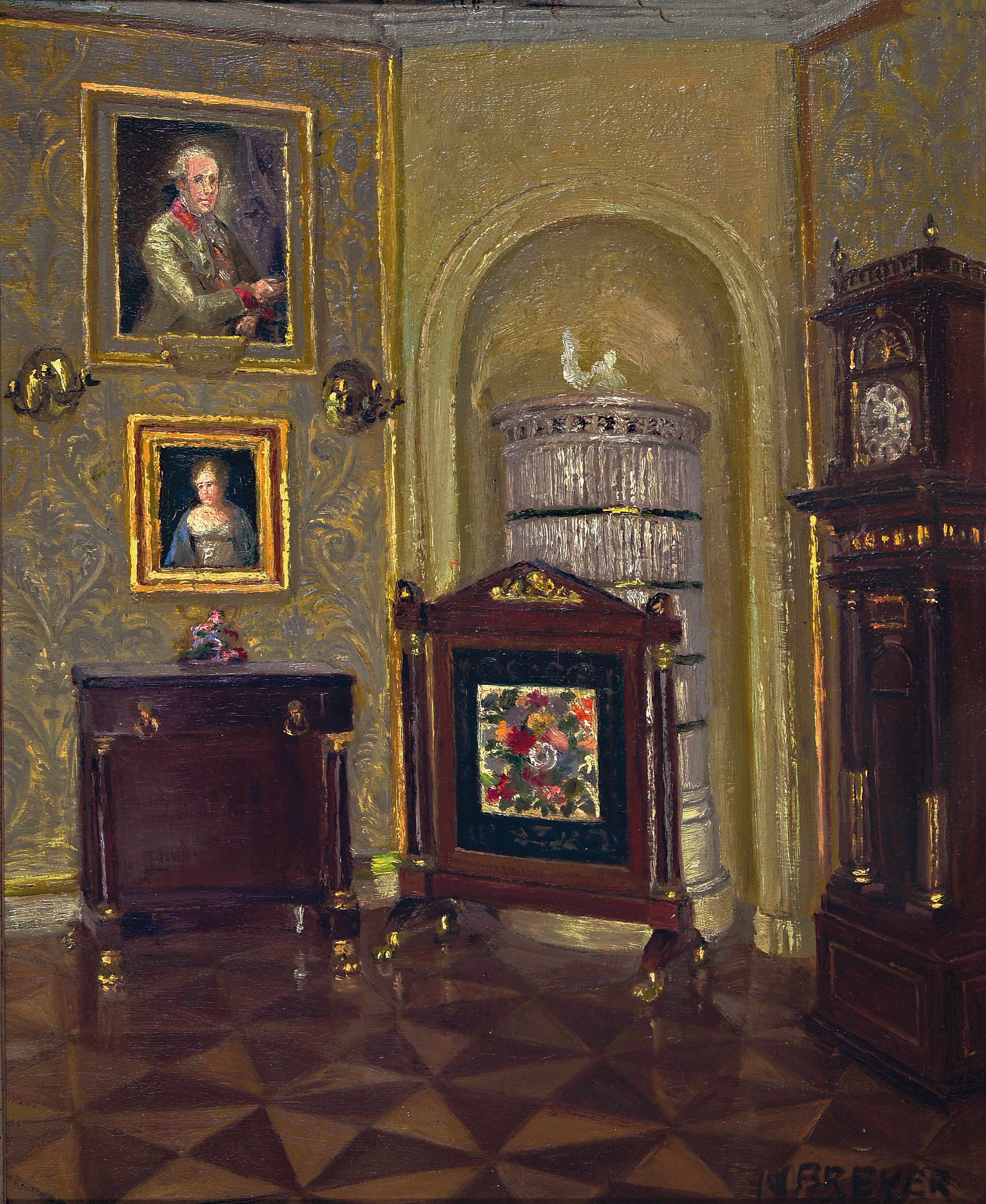 Robert Breyer, 1866 Stuttgart-1941 Bensheim, Interieur mit Kachelofen, Ofenschirm, Standuhr und Gemälden, Öl/Lwd, rechts unten signiert, ca. 54x44cm, R. ca. 65x55cm