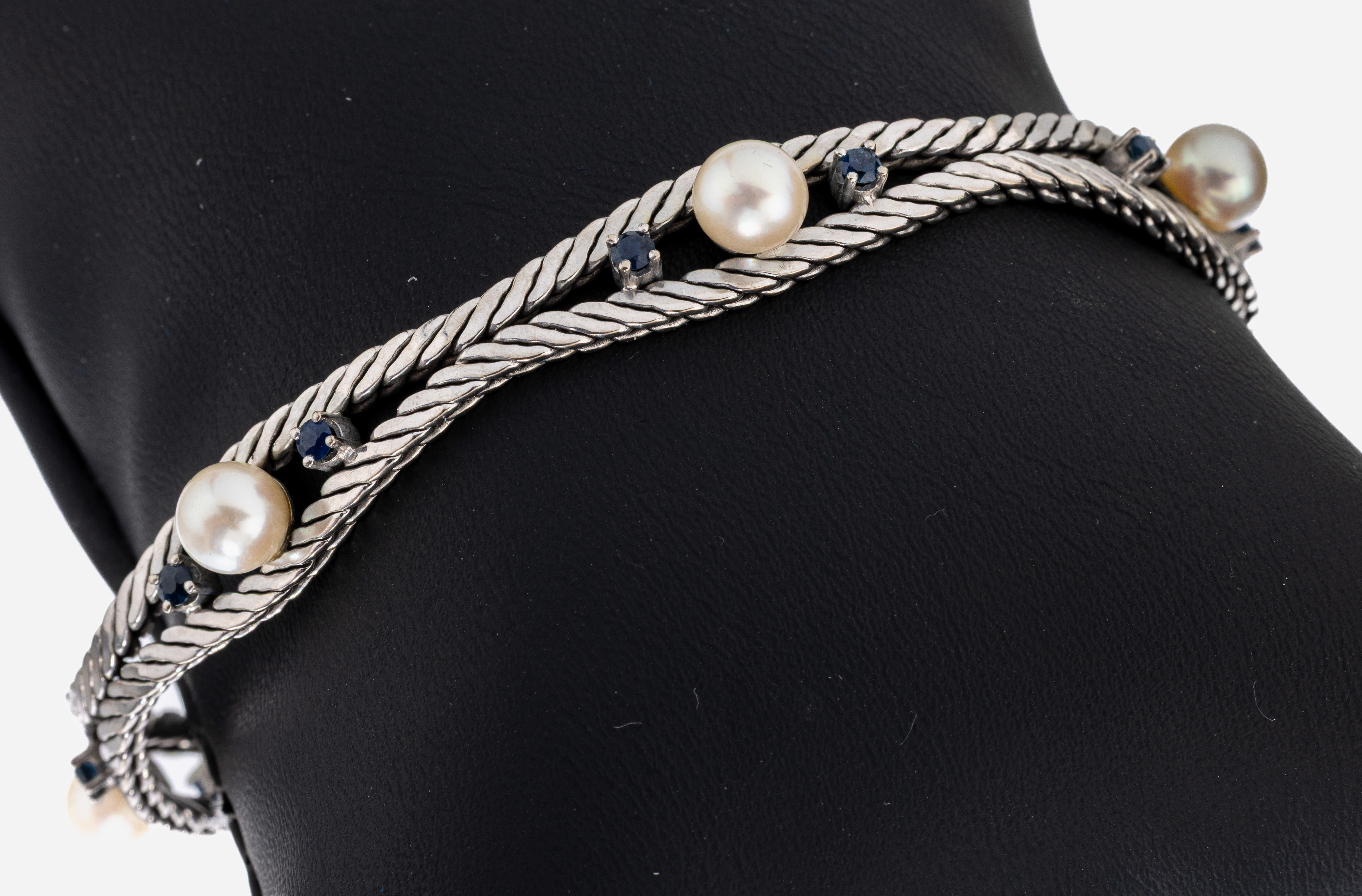 14 kt Gold Perl-Saphir-Armband, WG 585/000,5 weiße Zuchtperlen, 10 rundfacett. Saphire,