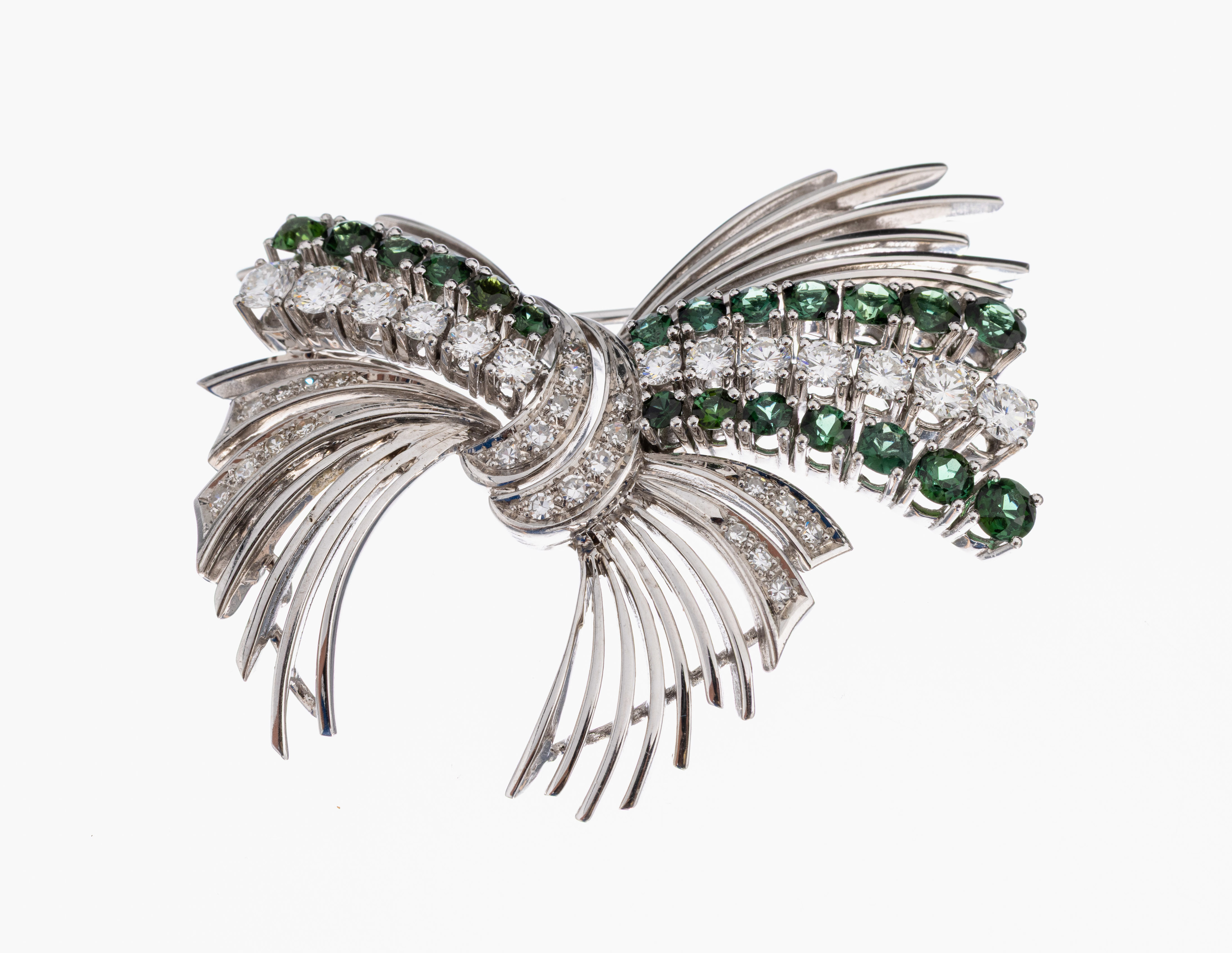 14 kt Gold Diamant-Turmalin-Brosche, WG 590/000, Schleifenform, 13 Brillanten zus.