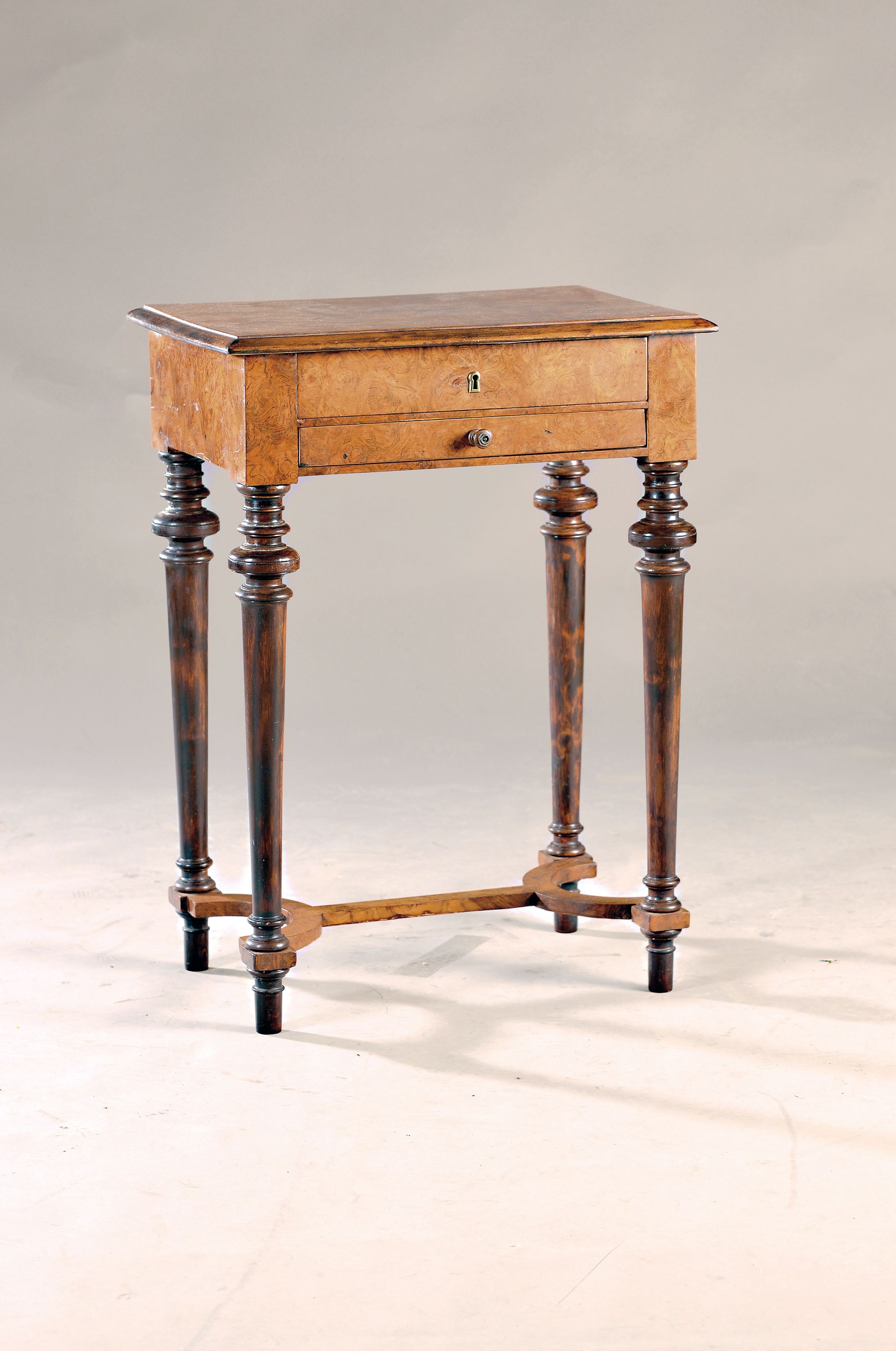 Beistelltischchen, Gründerzeit, vier gedrechselte Füße, zwei Schübe, ca. 77x57x39