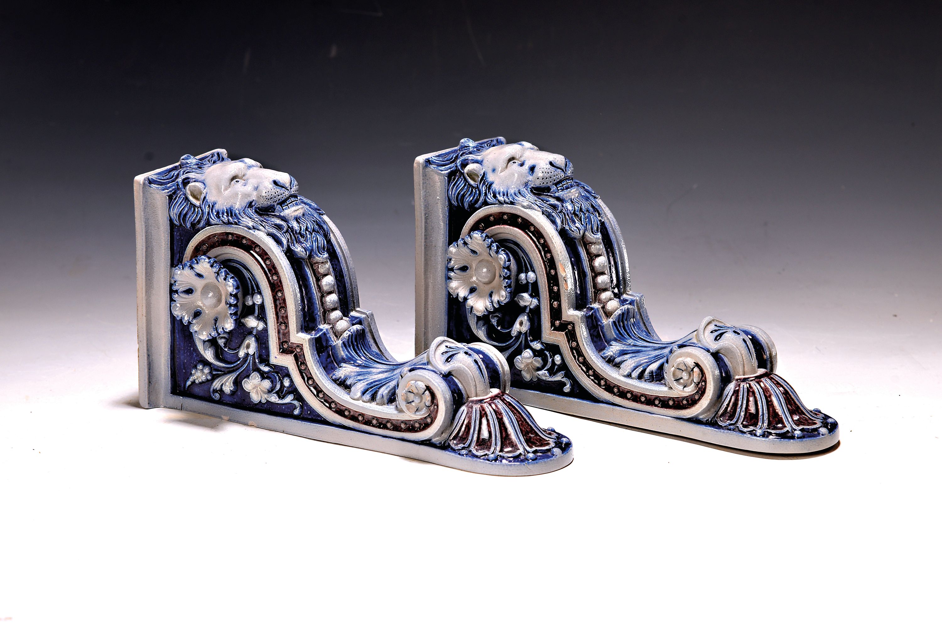 Paar Wandkonsolen, Westerwald, um 1900, Steinzeug, grau glasiert, reich reliefiert