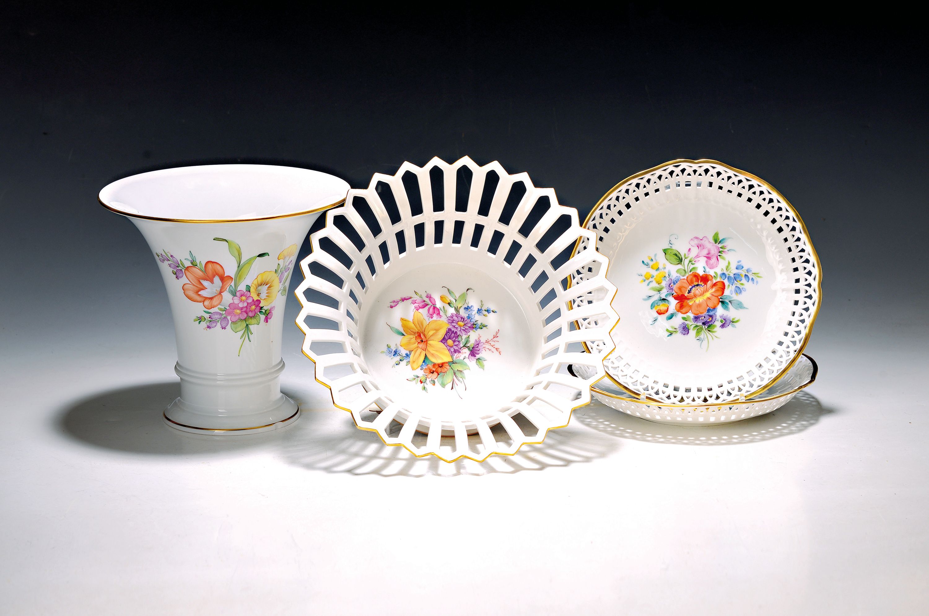 4 Teile Porzellan, KPM Berlin, 20. Jh., Korbschale in Durchbrucharbeit, Goldrand,