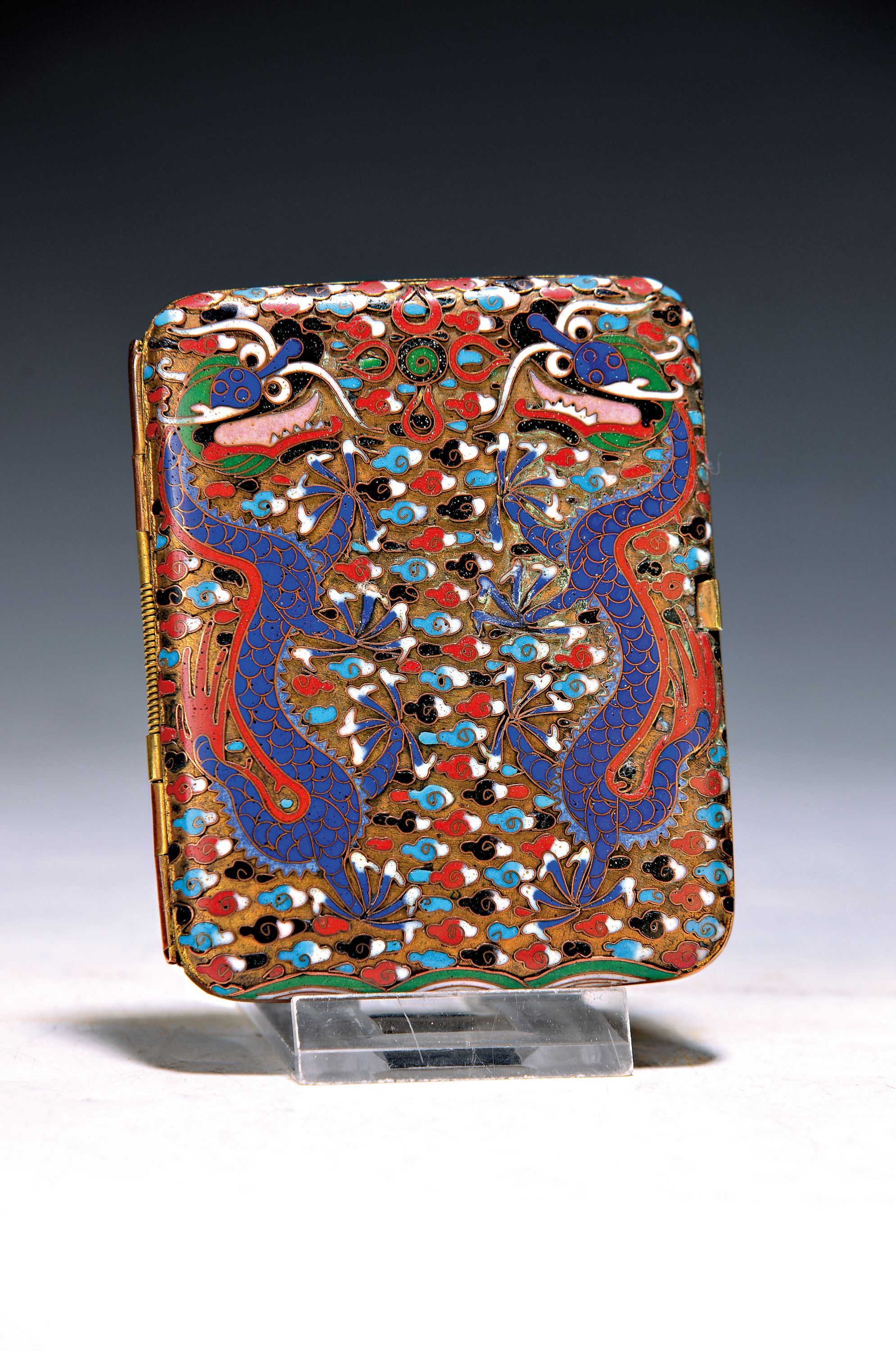 Zigarettenetui, China, um 1900, Kupfer, innen vergoldet, außen reich bunt emailliert