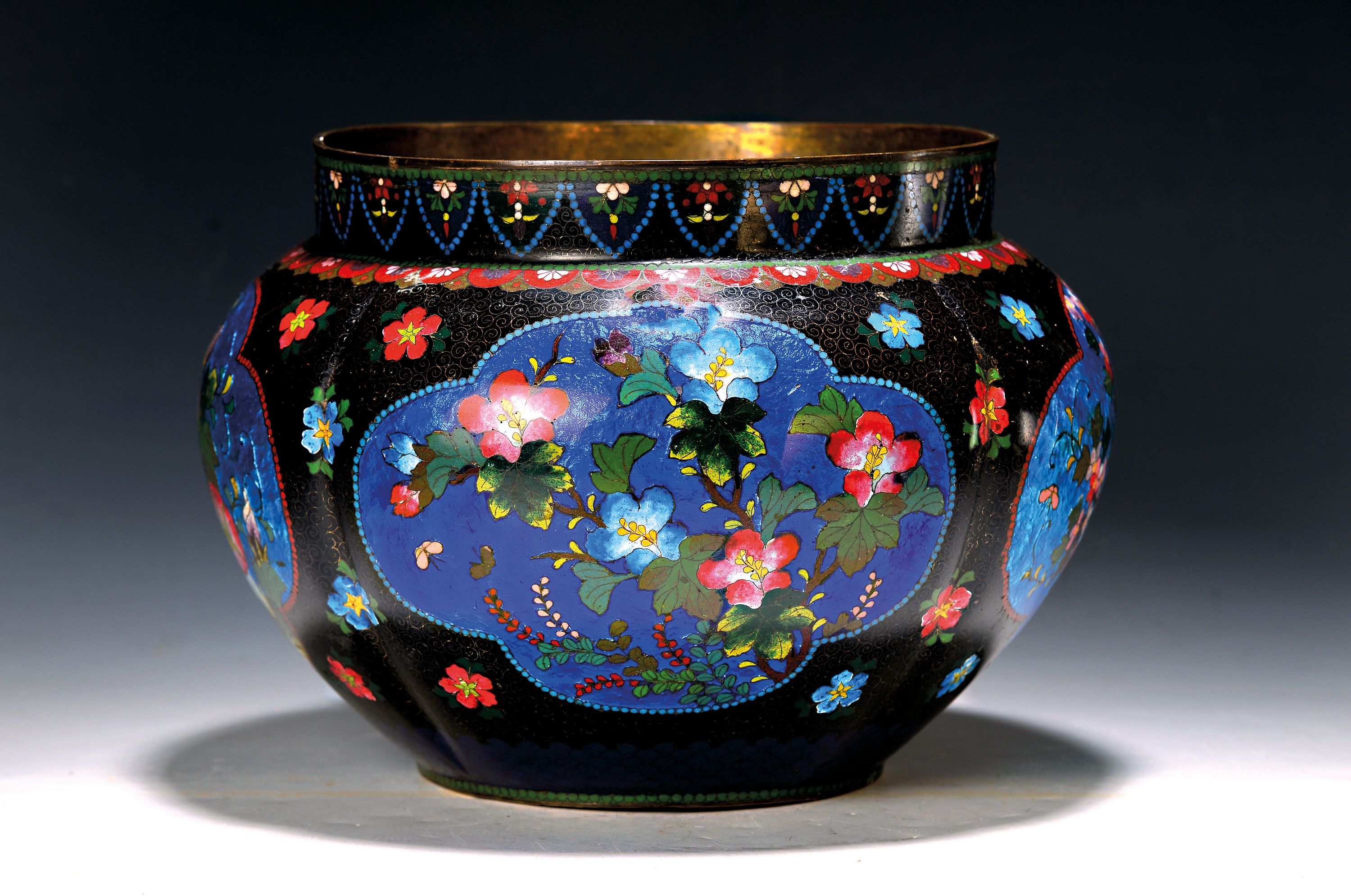 Großer Cachepot, China, um 1900, dünnwandiger Metallkorpus, reich fein bunt emailliert,