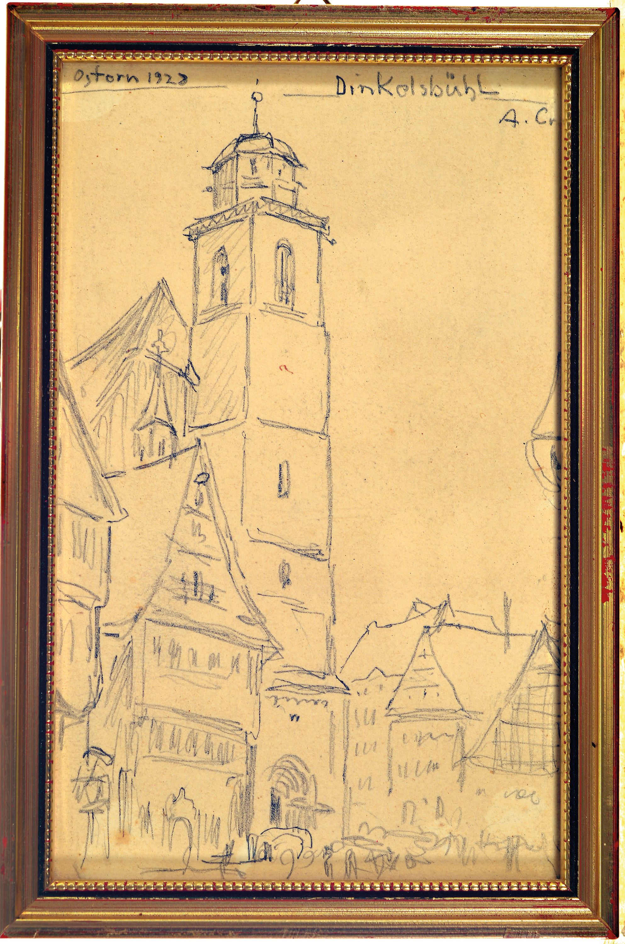 August Croissant, 1870-1941 Landau, Bleistiftzeichnung "Dinkelsbühl Ostern 1928", rechts oben monogrammiert A.Cr., unter Glas gerahmt 19x12,5 cm