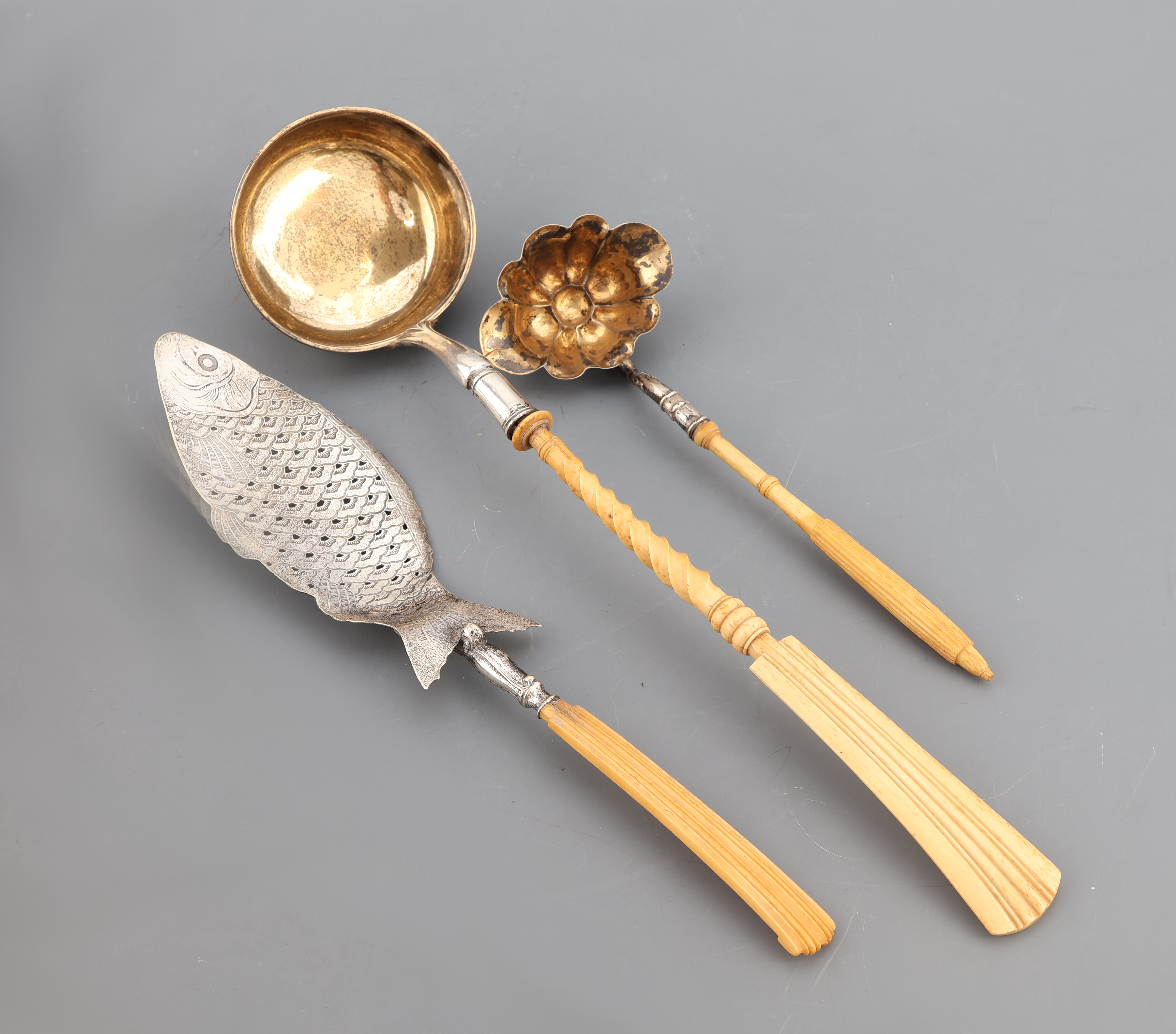 Konvolut 3 Vorlegeteile, 1 x gr. Suppenkelle, um 1900, 800er Silber teilverg., Griff