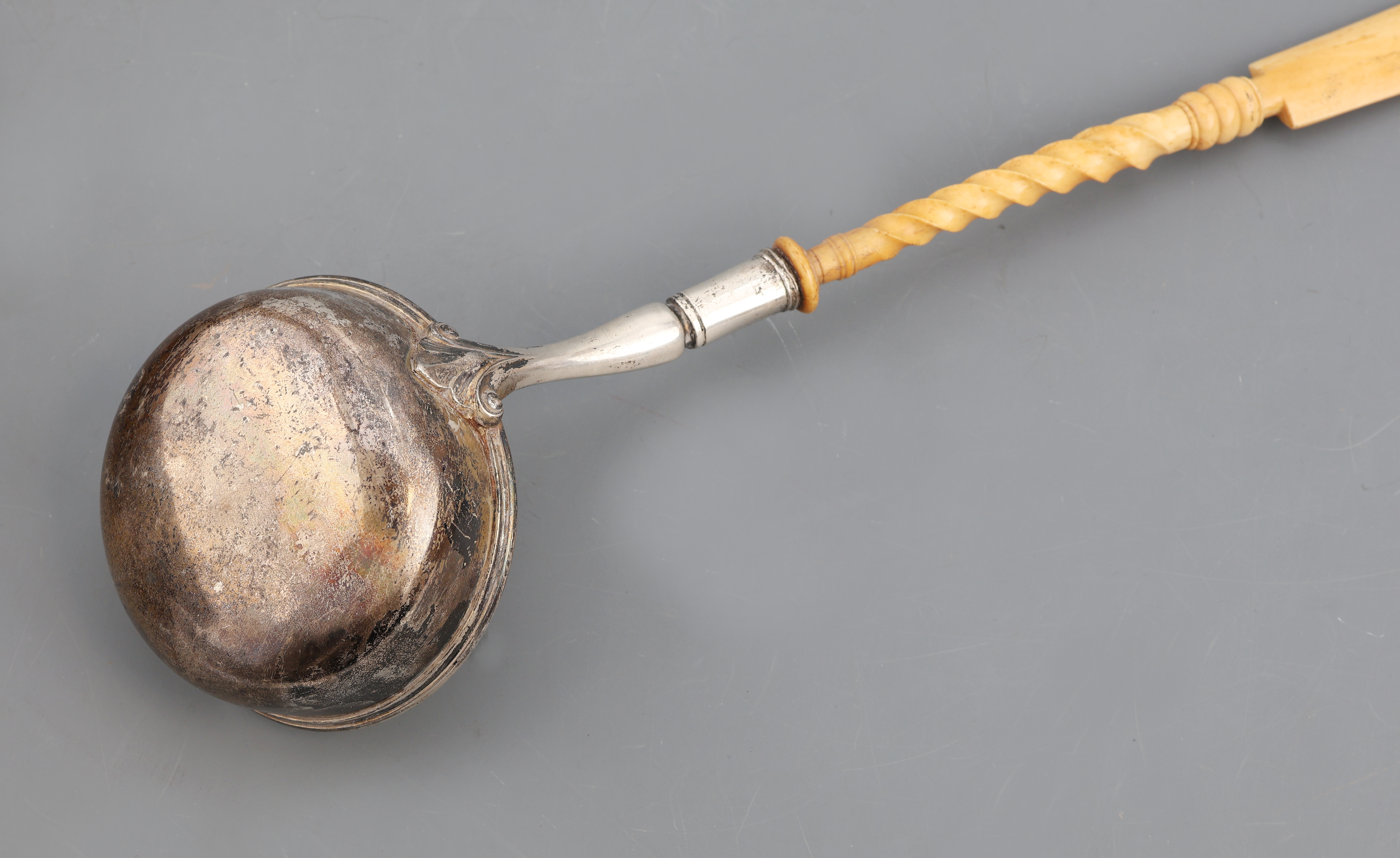 gedrechseltes Bein, L. ca. 38 cm, 1 x Kelle, um 1870, 13-Lot Silber, teilverg., Griff