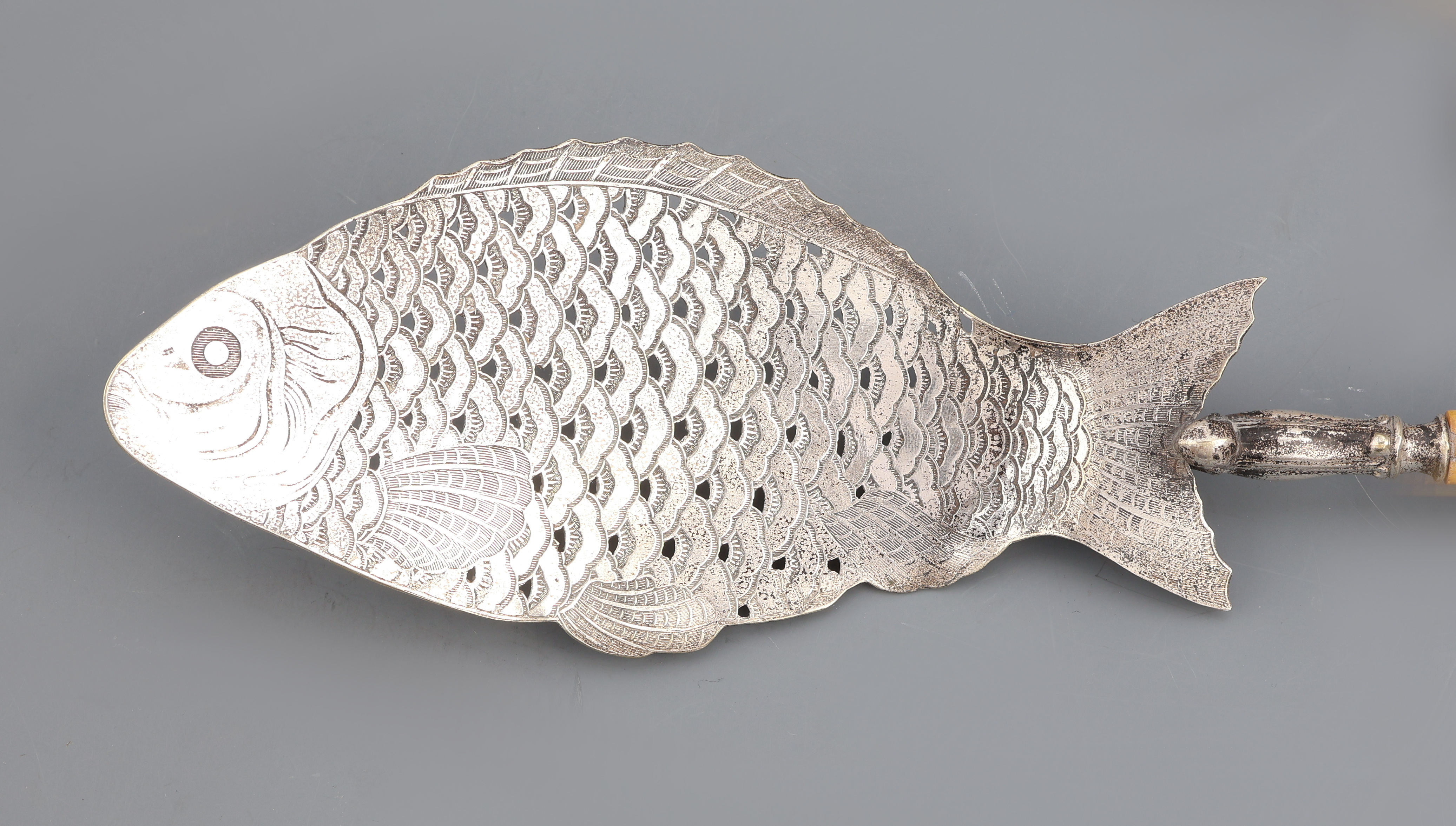 gedrechseltes Bein, und 1 x Fischvorlegeteil, Gebrauchsteil in Form eines Fischs,