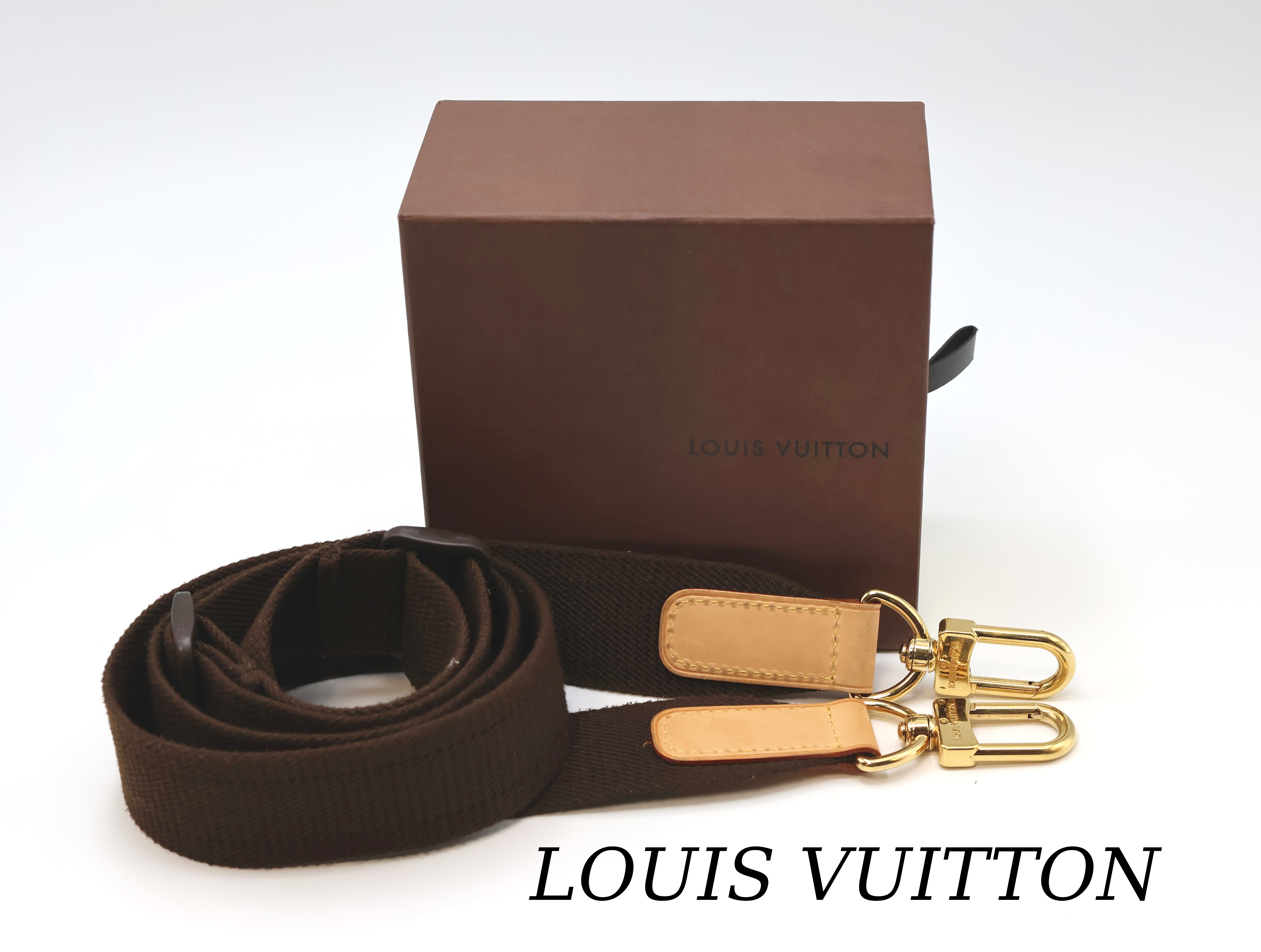 LOUIS VUITTON Tragegurt, brauner Stoff, Rindslederabschluss, Monturen Metall verg.,