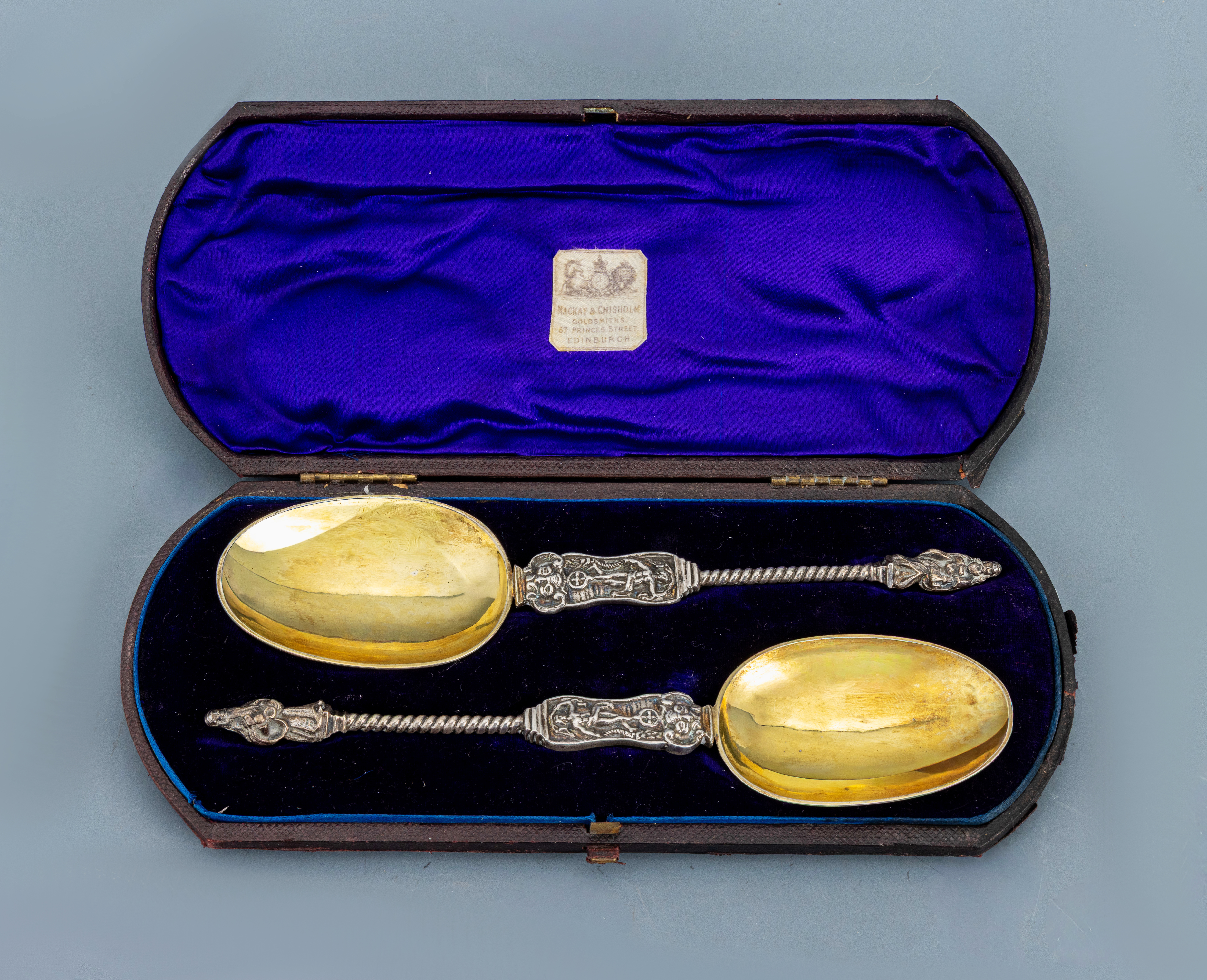 Set 2 sogn. Apostellöffel, wohl Schottland, 1878, Silber gepr., Laffen verg., Stiel
