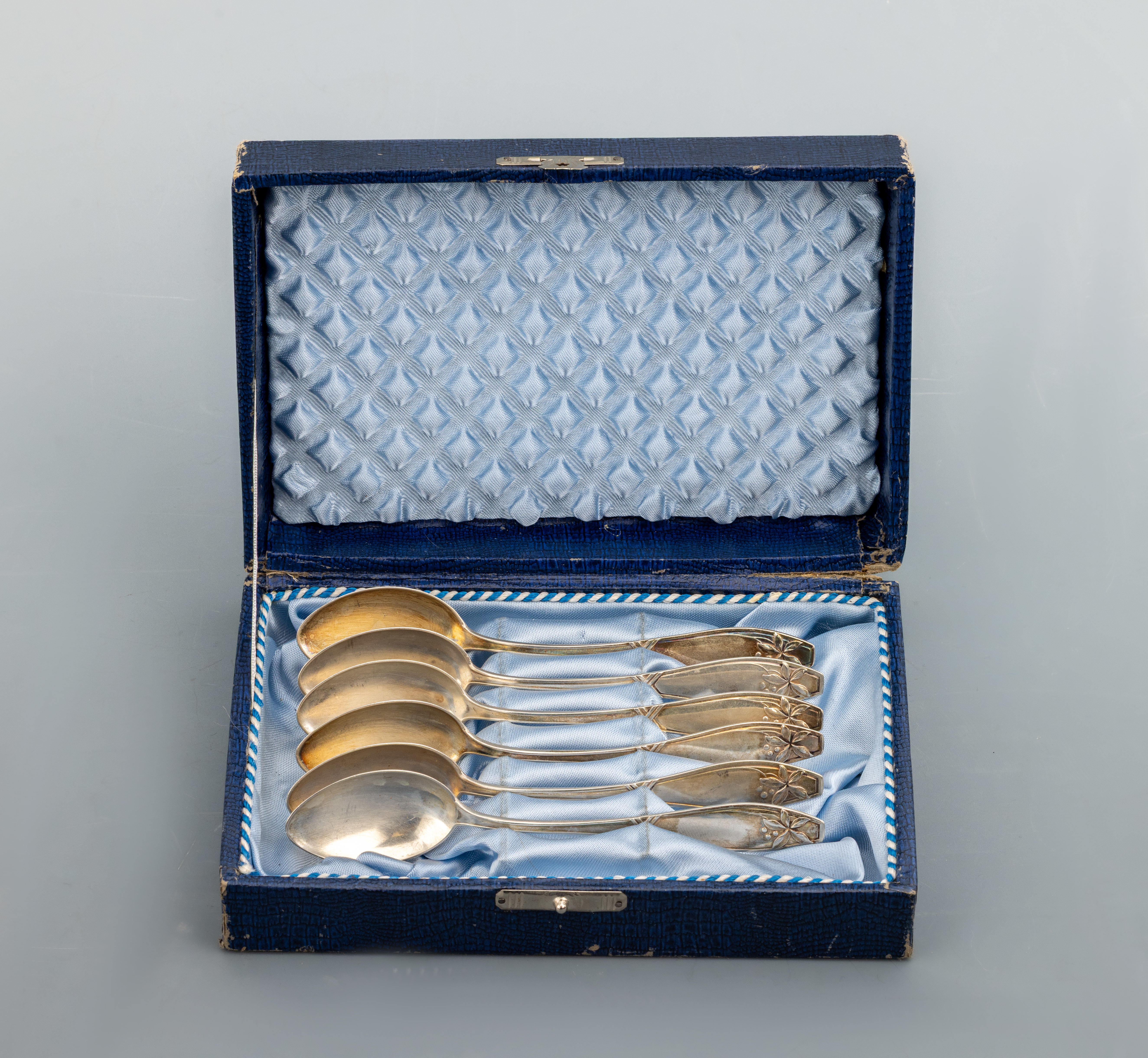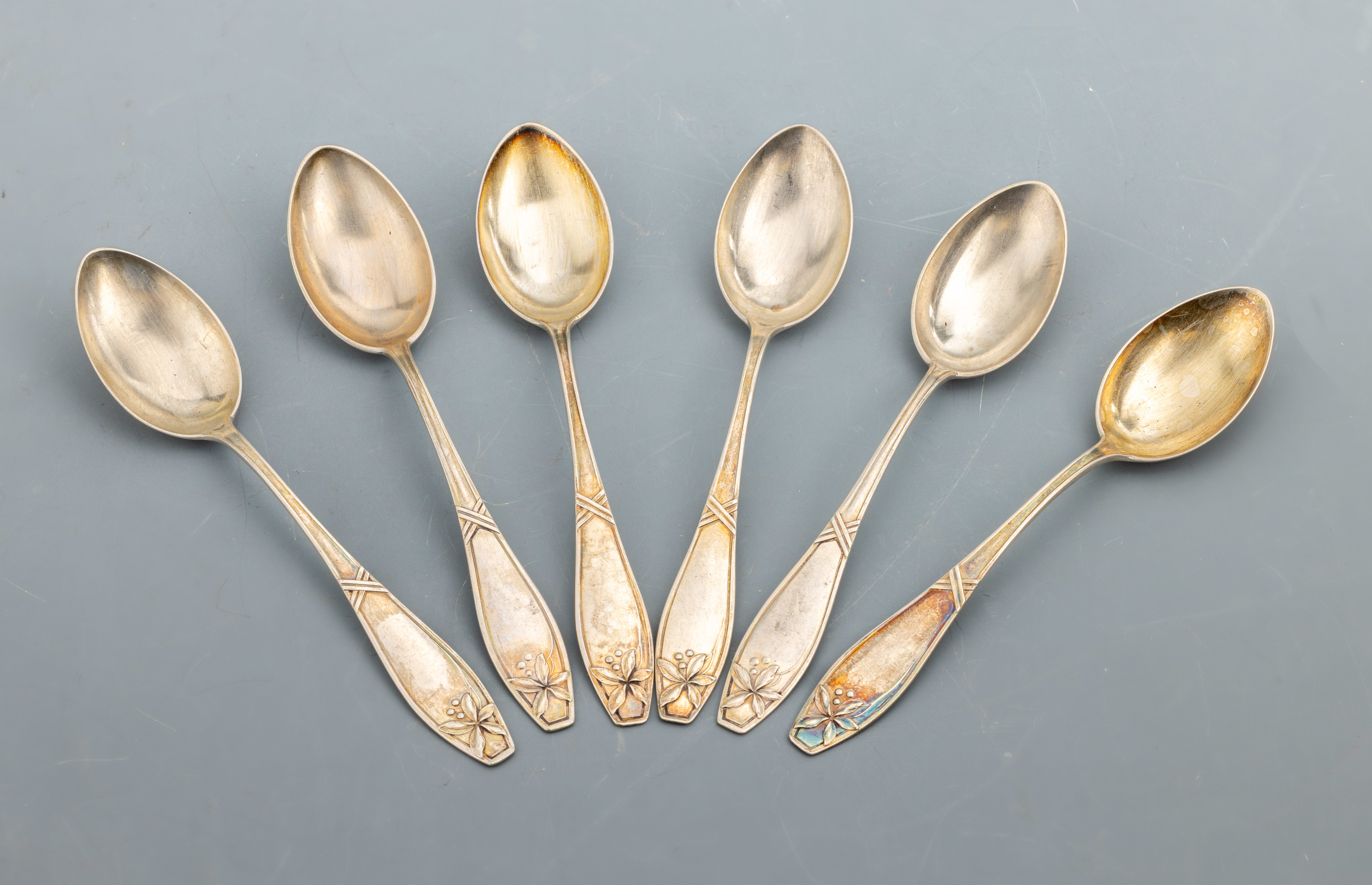 Set 6 Kaffeelöffel, 800er Silber, Entwurf um 1905-10, floral mit Kreuzband, L. ca.