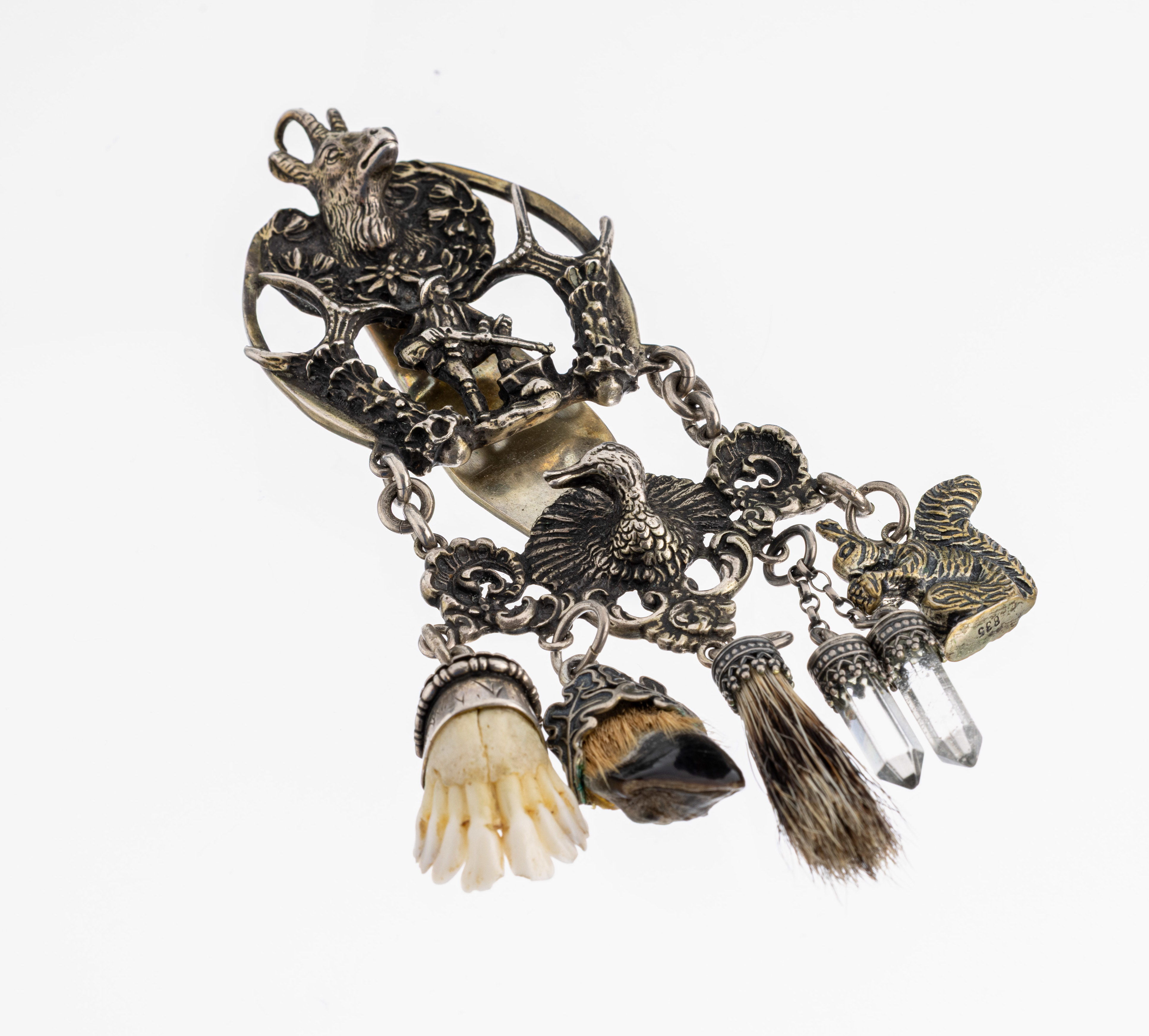 1 x mit Dachshaar, 1 x Rehhuf, Fassung mit Eichenlaub, und 1 x Rehgebiss, rs. Clip