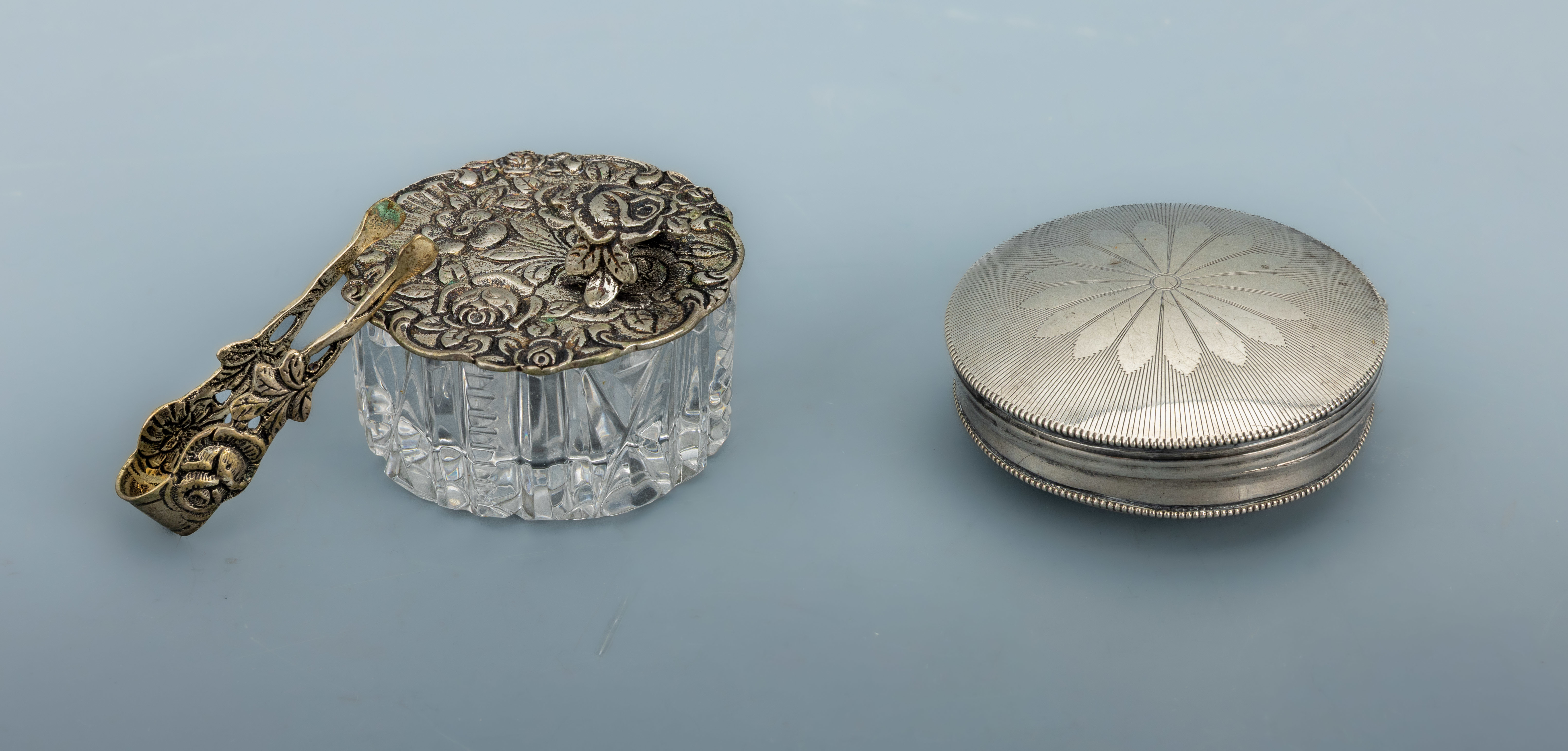 Konvolut 2 Dosen, 1 x Pillendose, Silber gepr., rund, Deckel und Boden grav., D.