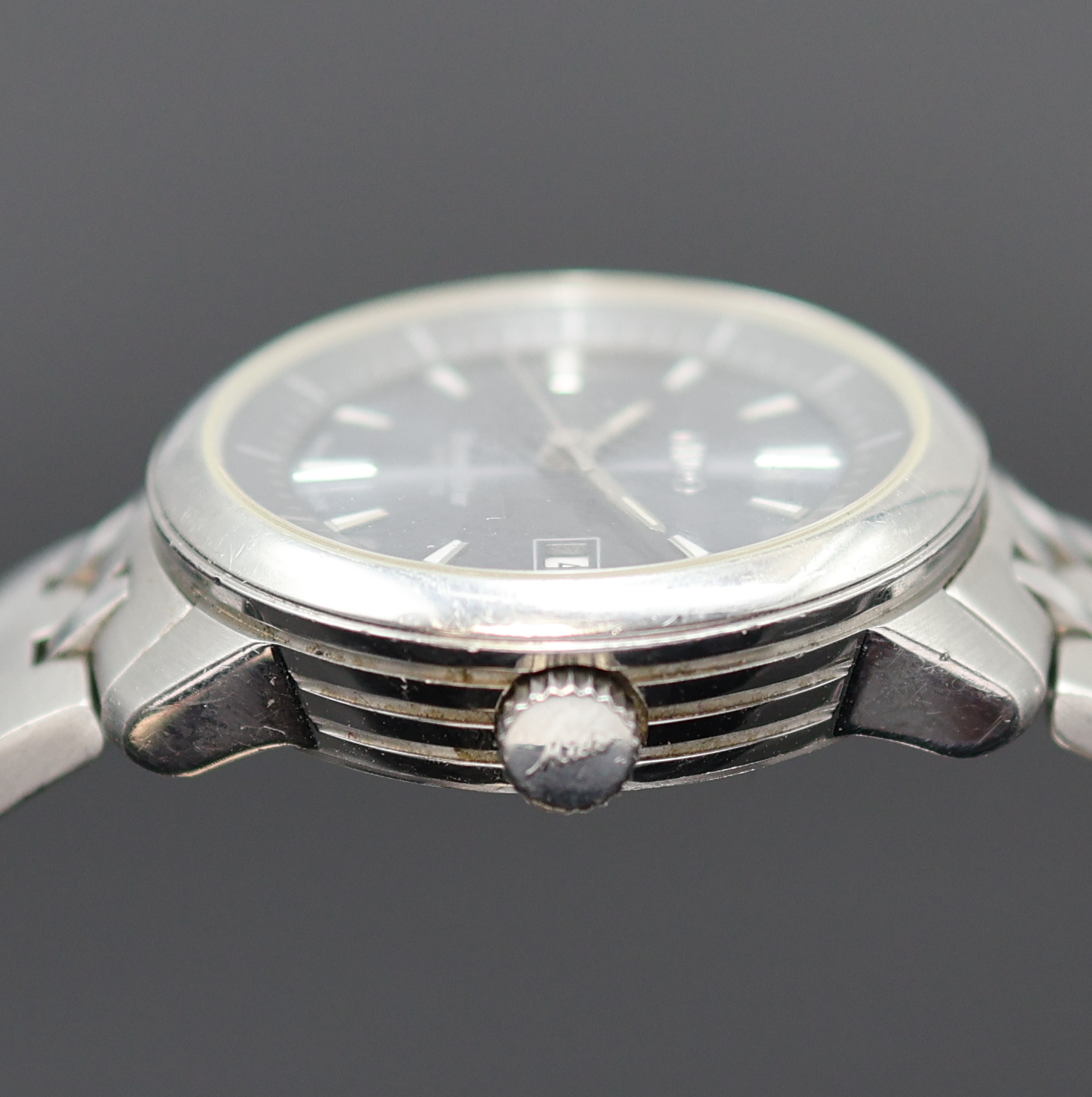 Zifferbl. m. aufges. Leuchtind., silb. Leuchtzeiger, Datum b. 3, vern. Werk Kal.