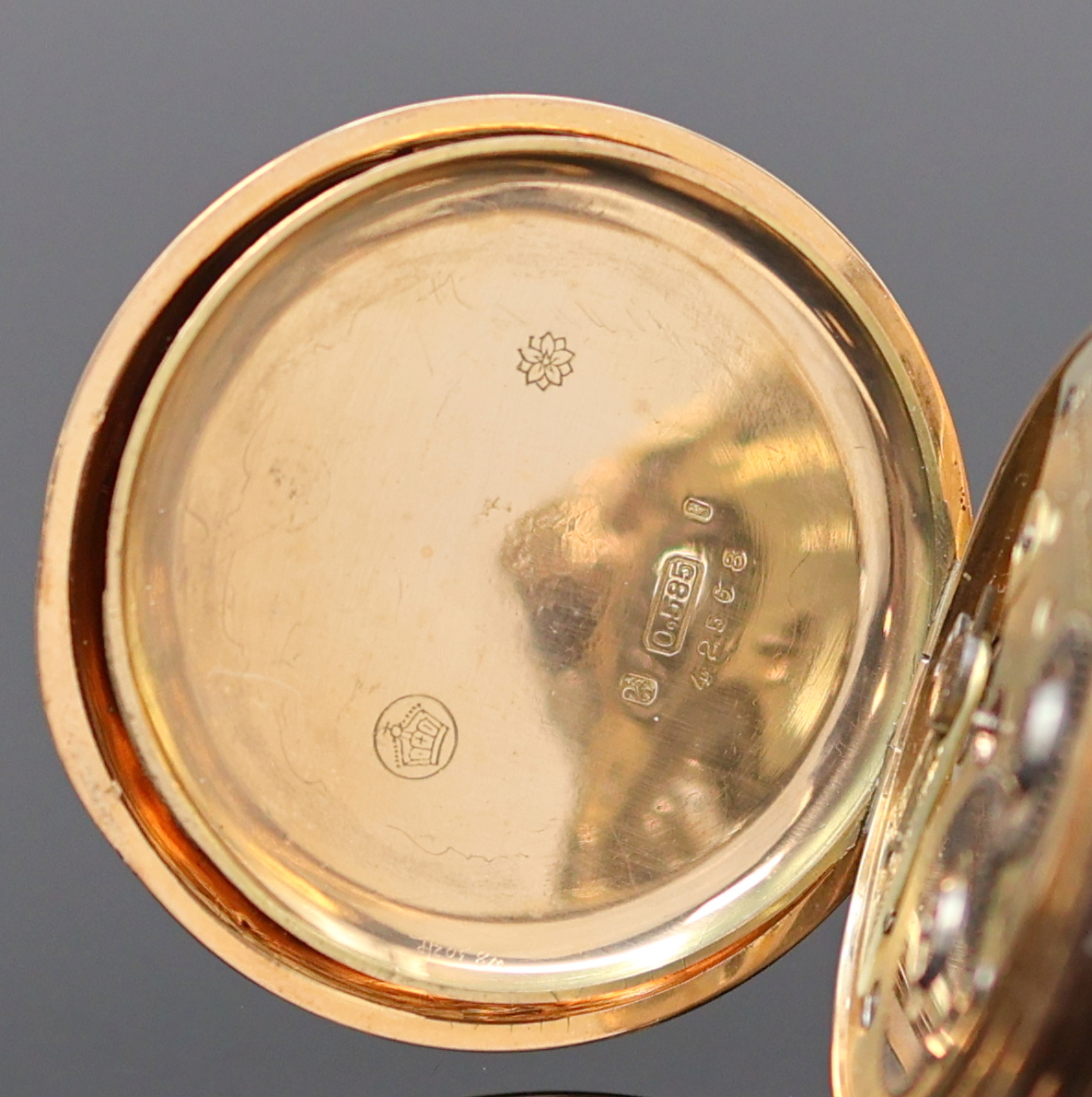 1910, ehm. guill. 3-Deckel-Goldgeh. dell., Emailzifferbl. riss., arab. Zahlen, gold.