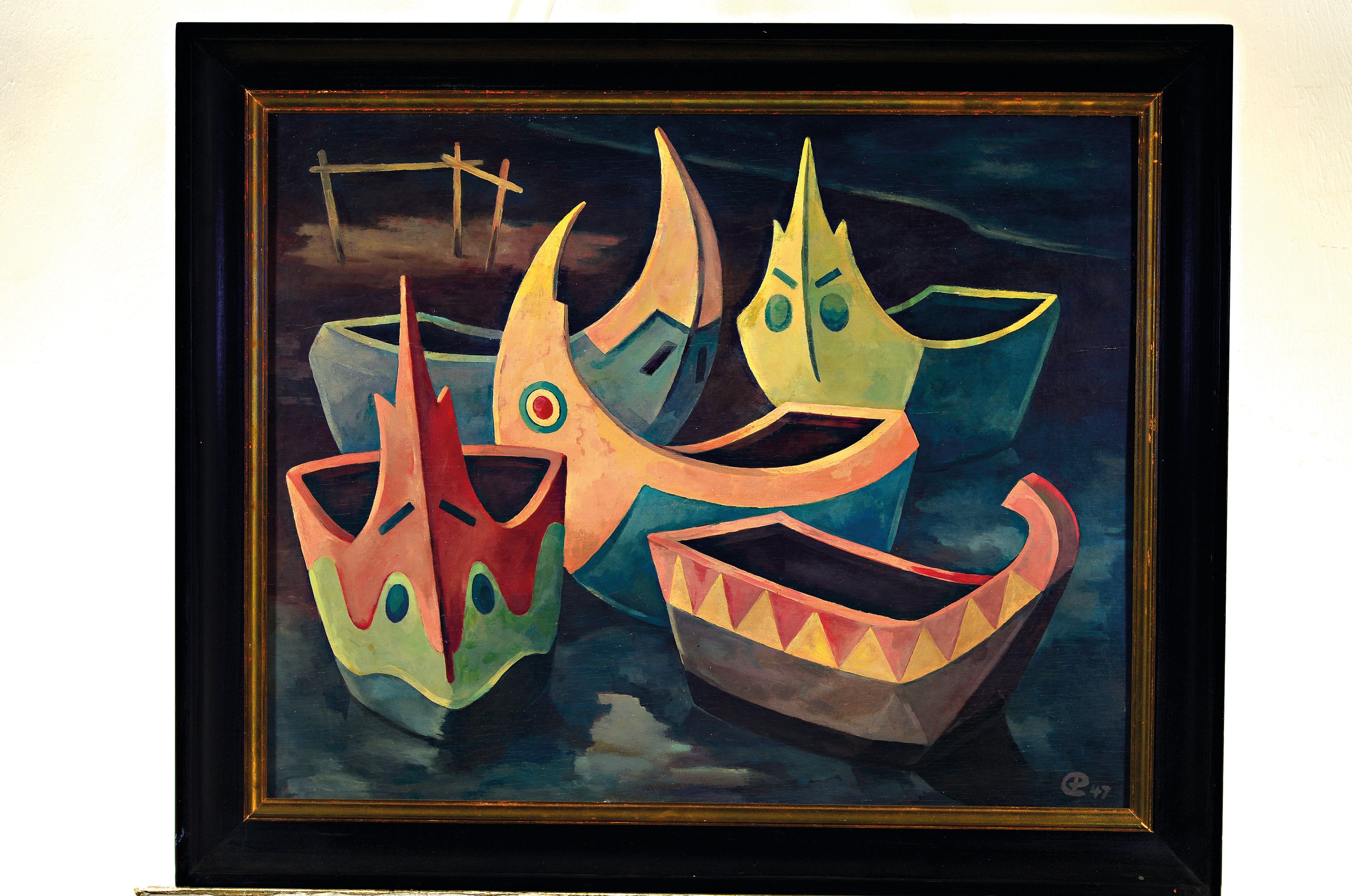 Gerhard Pommeranz-Liedke, 1909-1974, Kaneval der meia luas, Halbmondboote in Nazare/Portugal,