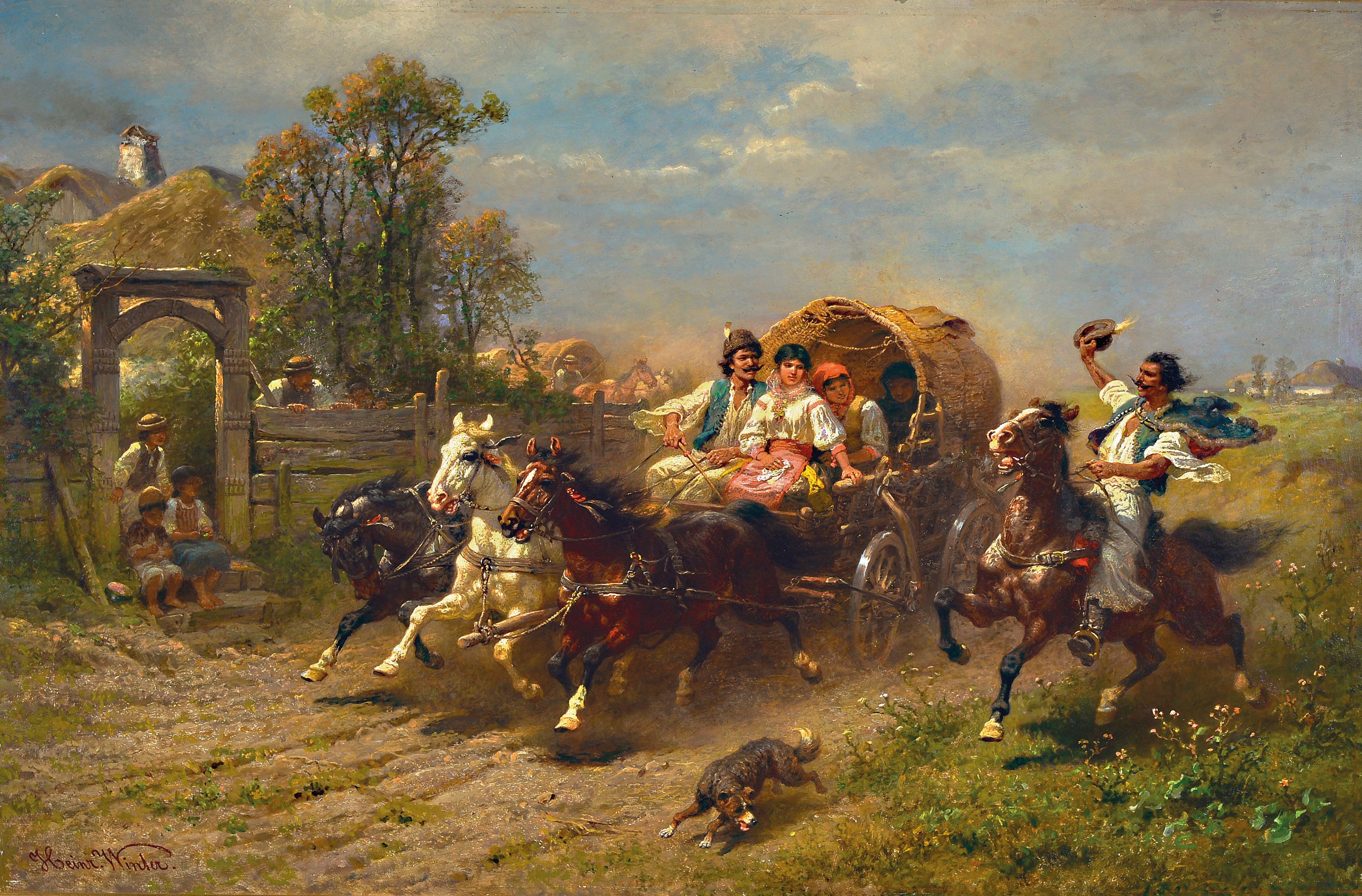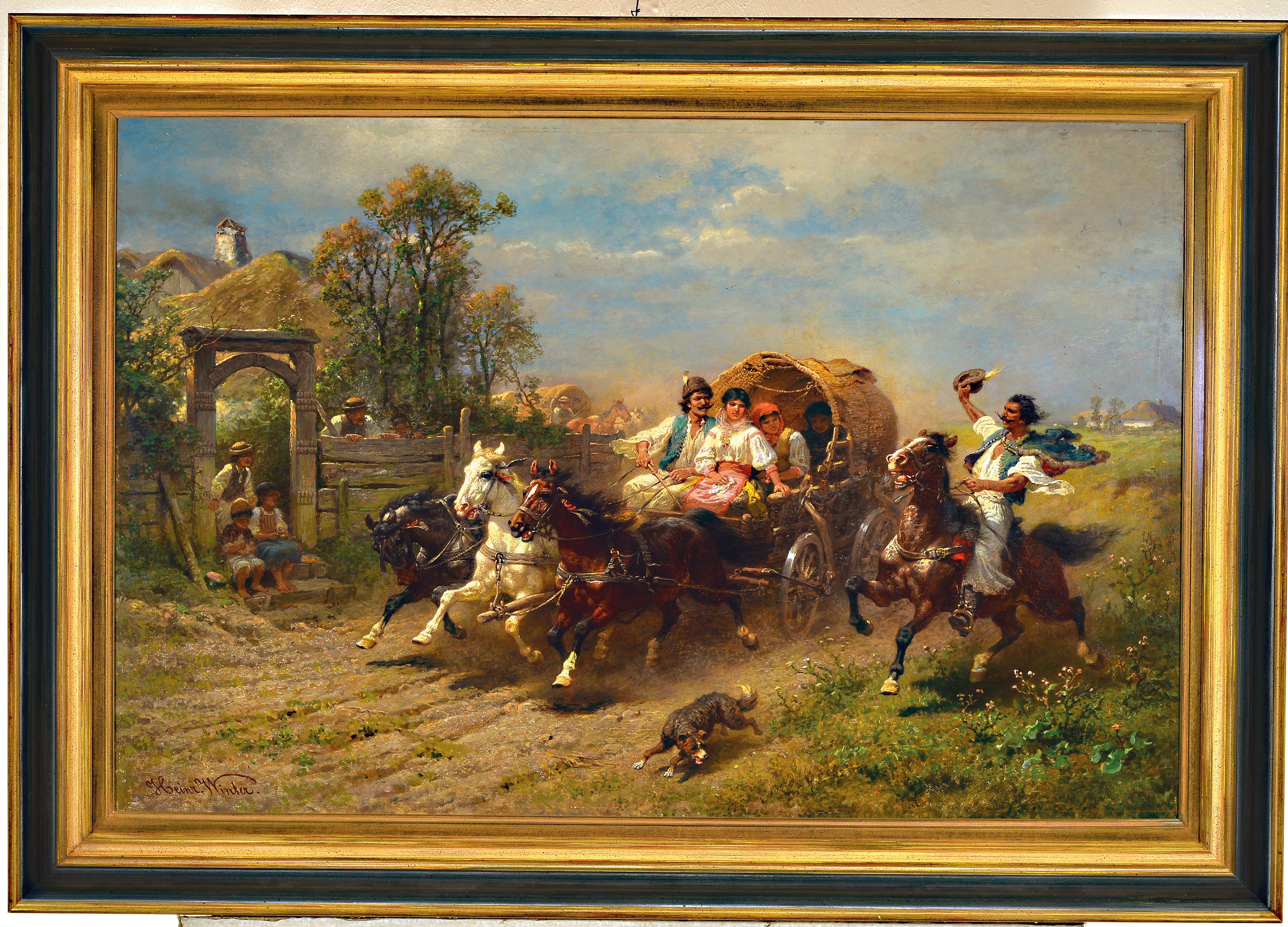 Heinrich (Ludwig, Christian, Dietrich) Winter, 1843 Frankfurt am Main-1911 Kronberg, Personen in dreispännigem Planwagen, seitlich ein einzelner Reiter, links Zuschauende hinter einem Gartenzaun, Öl/Lwd, links unten sign., ca. 62x45cm, R. ca. 77x108cm