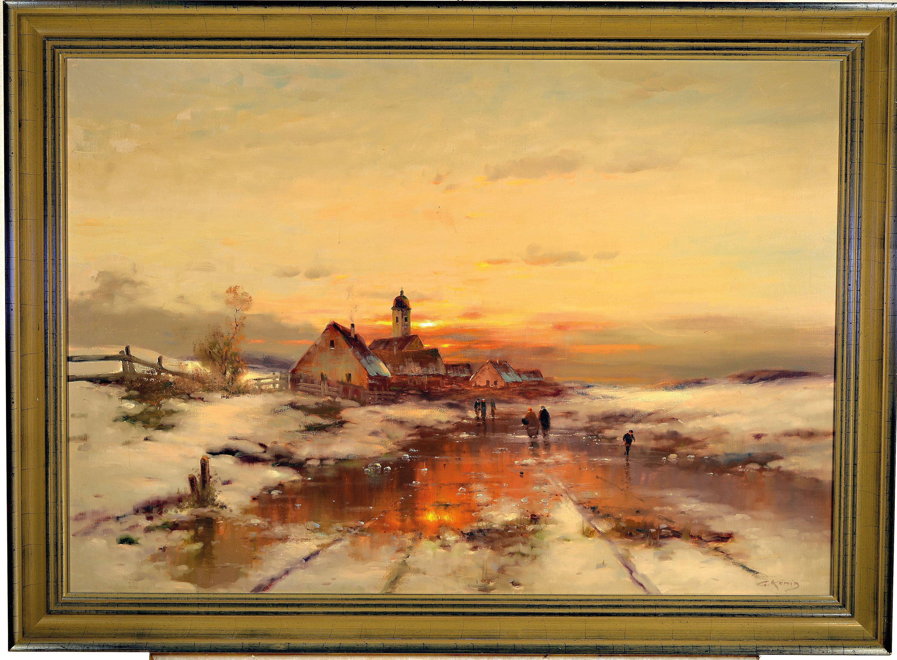 Günther König, geb. 1926 Düsseldorf, Weite Winterlandschaft im Abendrot, Personen