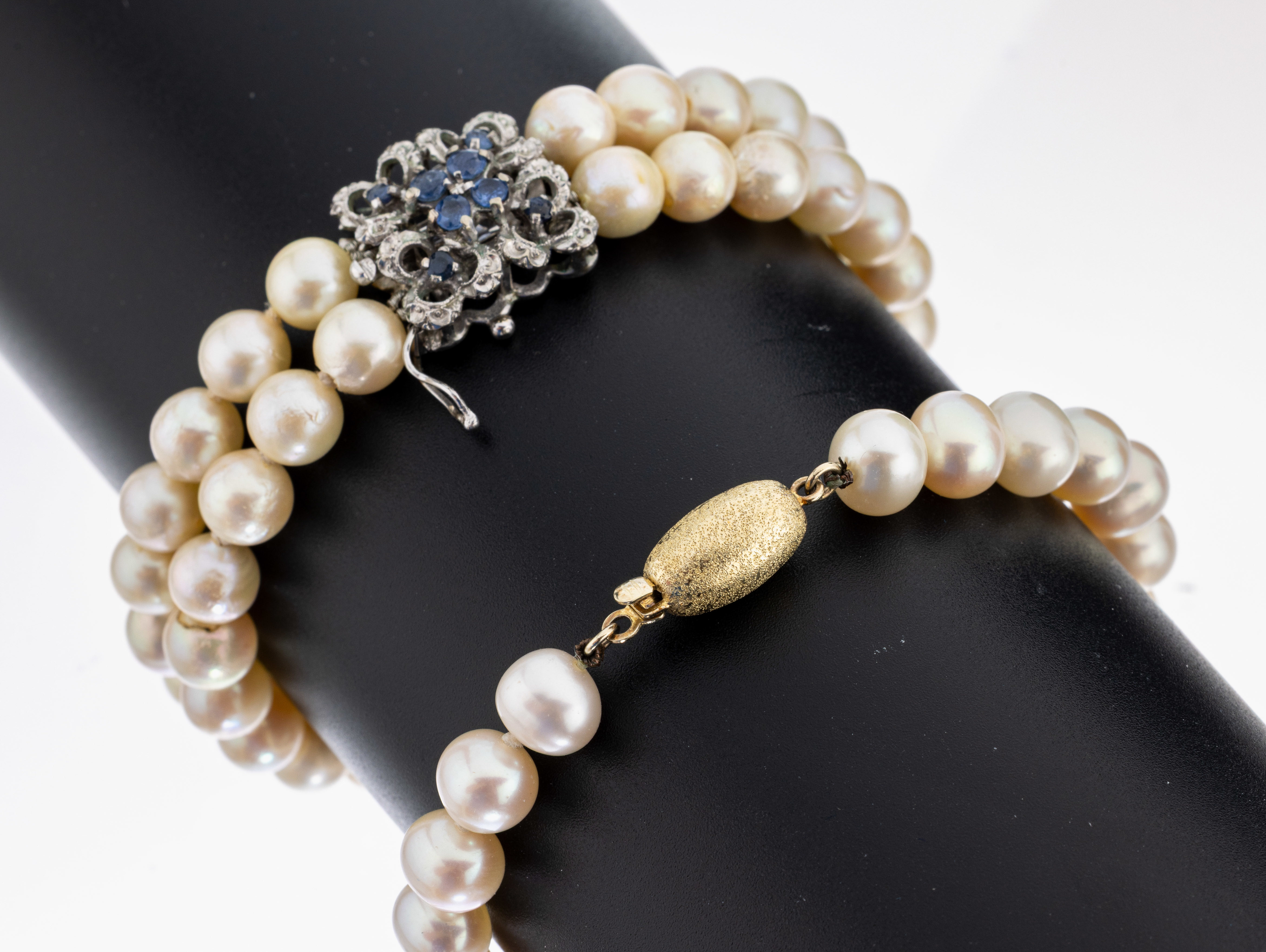 Konvolut 2 Zuchtperl-Armbänder, 1 x 2-rhg. Akoyazuchtperlen, D. ca. 6.9-7.2 mm,