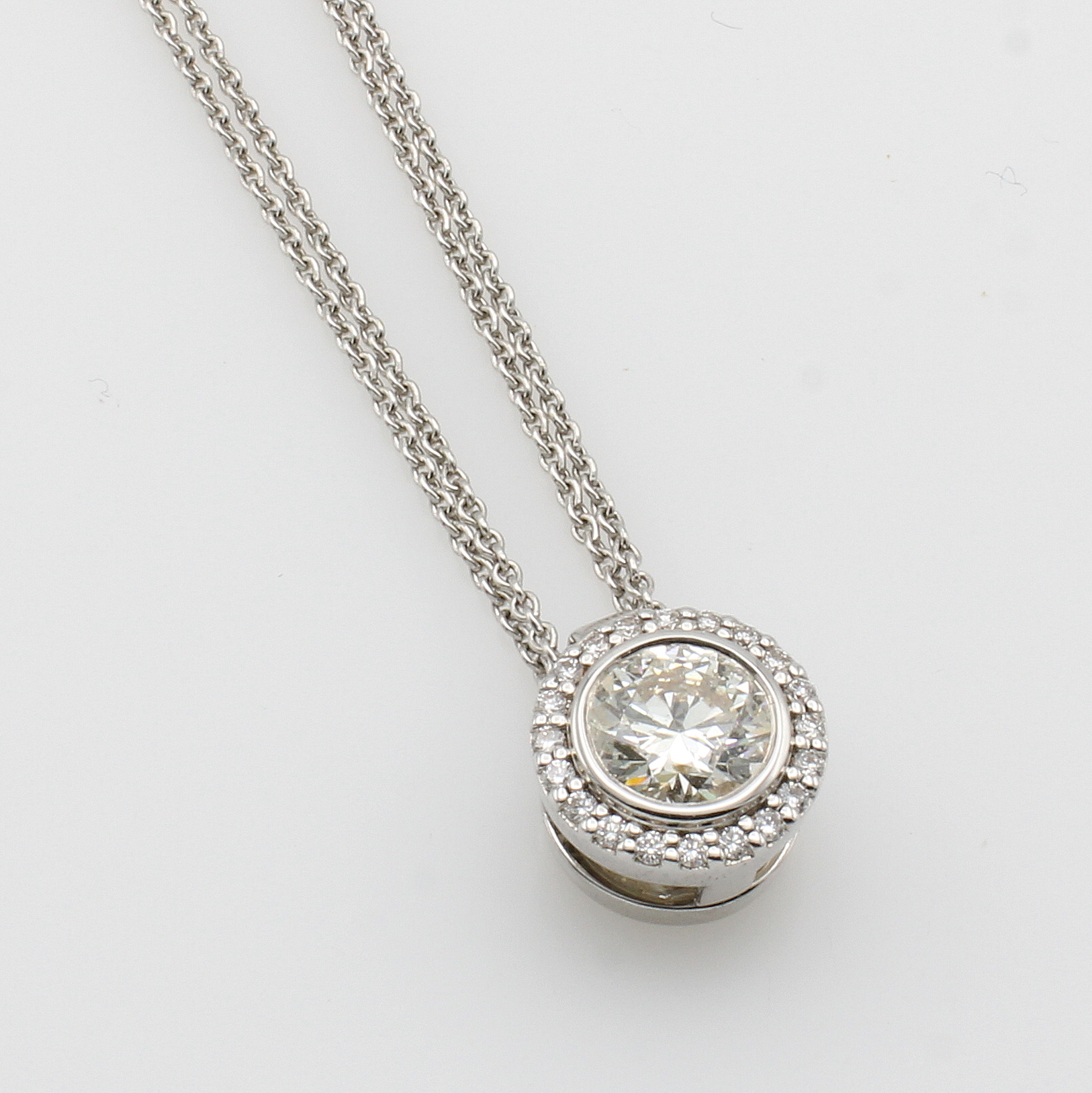 Anhänger an 2 reihiger Kette mit Brillanten, WG 750/000, Mittelstein ca. 1.01 ct Weiß/si2 u. Besatzbrill. zus. ca. 0.10 ct feines Weiß/ vs, L. ca. 43 cm Schätzpreis: 8540, - EUR